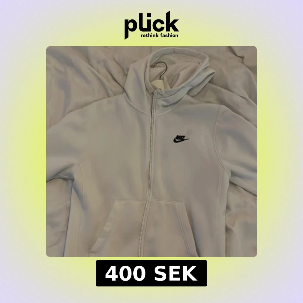 Säljer en stilren vit hoodie från Nike med dragkedja framtill och klassisk logga på bröstet. Tröjan har huva och två fickor framtill, perfekt för en sportig och avslappnad look.