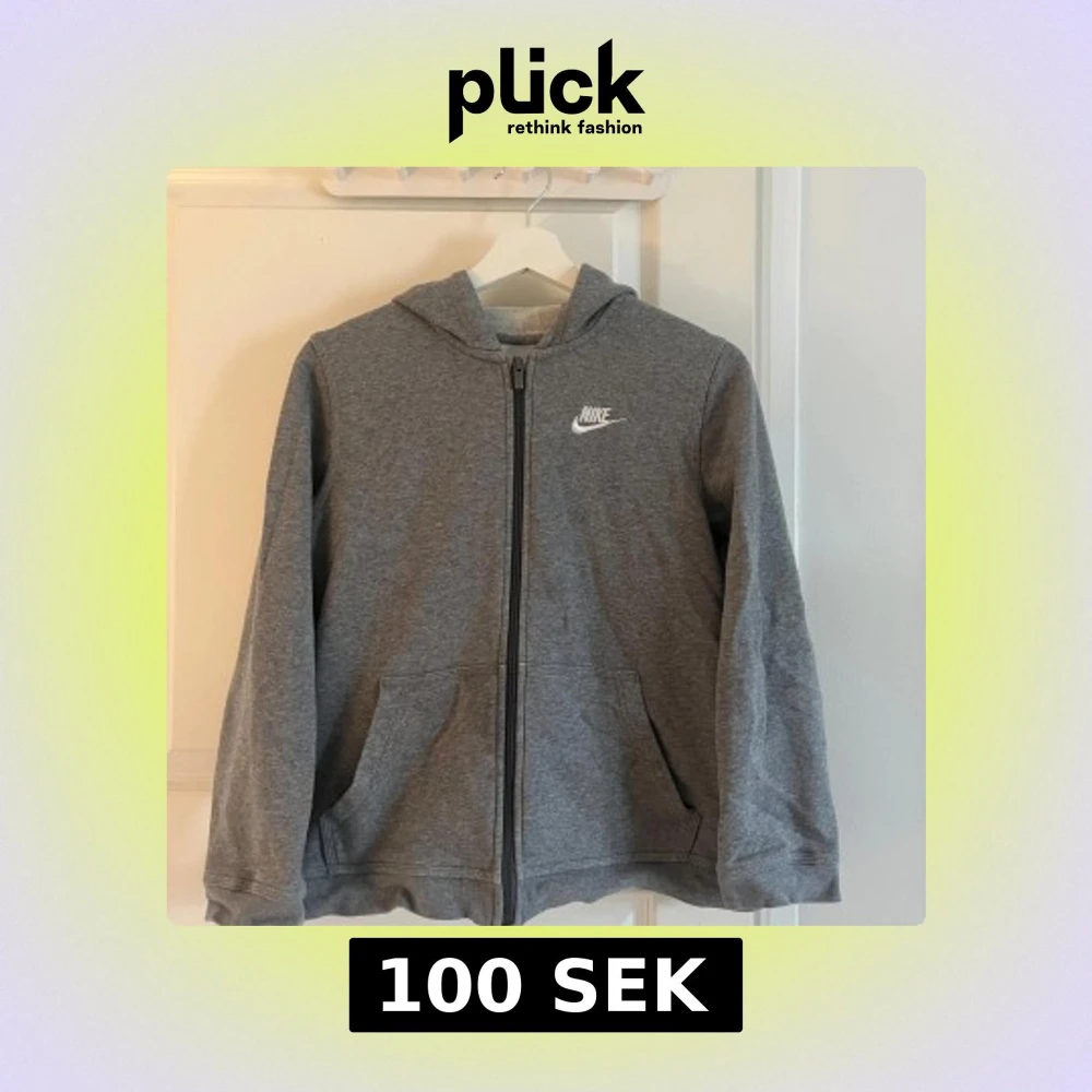 Säljer en grå hoodie från Nike med dragkedja och huva. Den har en klassisk design med Nike-logga på bröstet och praktiska fickor framtill. Perfekt för en avslappnad stil.