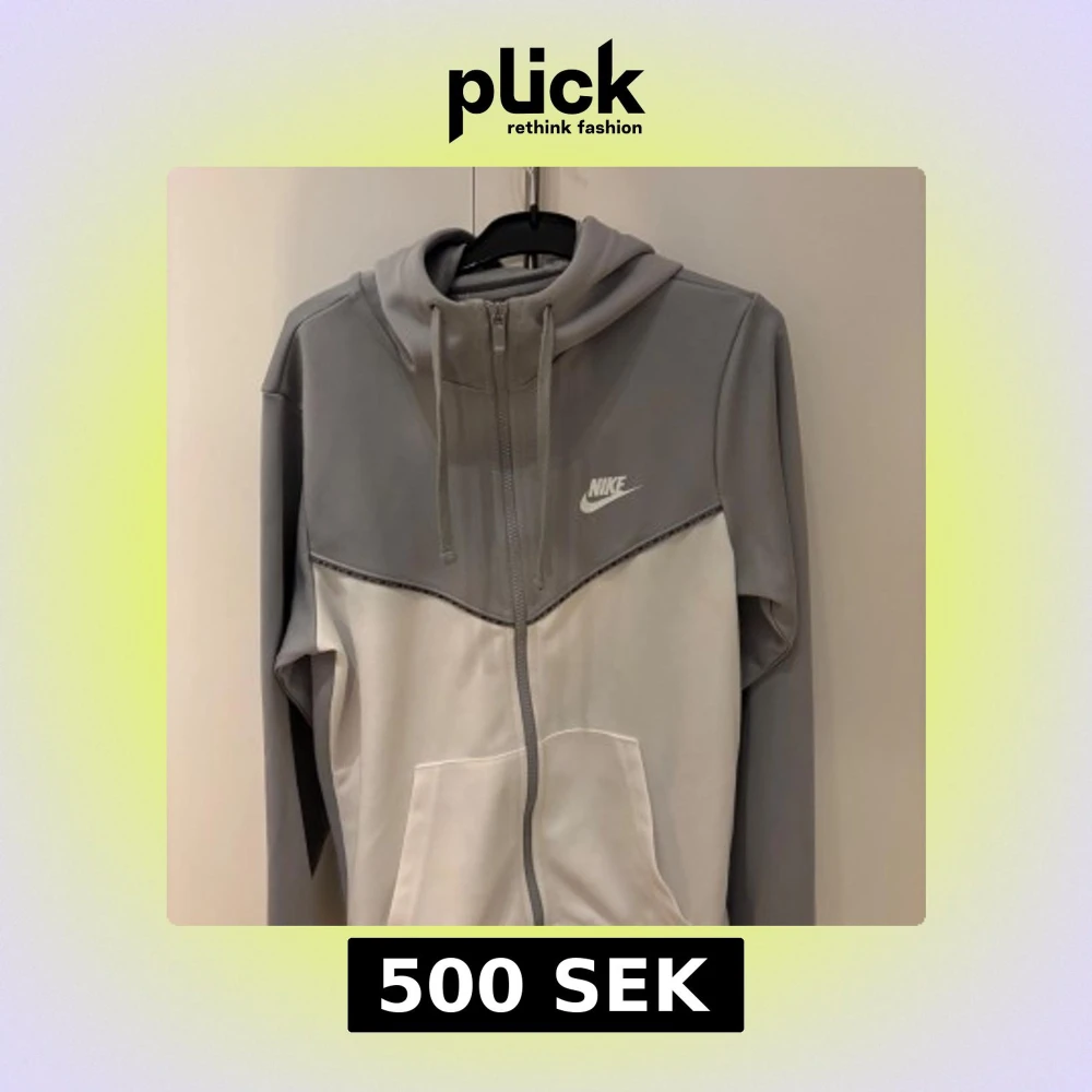 Nike hoodie i grått och vitt med hel dragkedja framtill och huva med snörning. Tröjan har fickor på magen och Nike-logga på bröstet. Perfekt för en sportig och avslappnad stil.