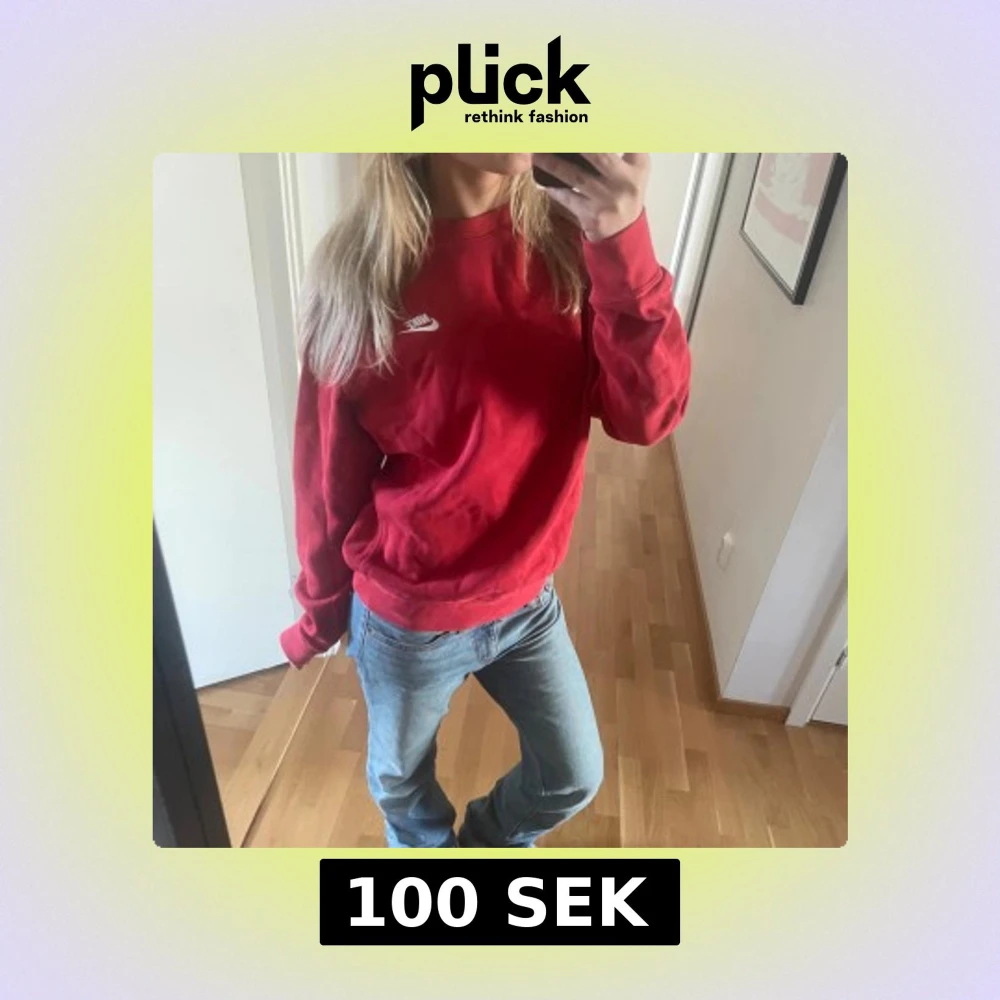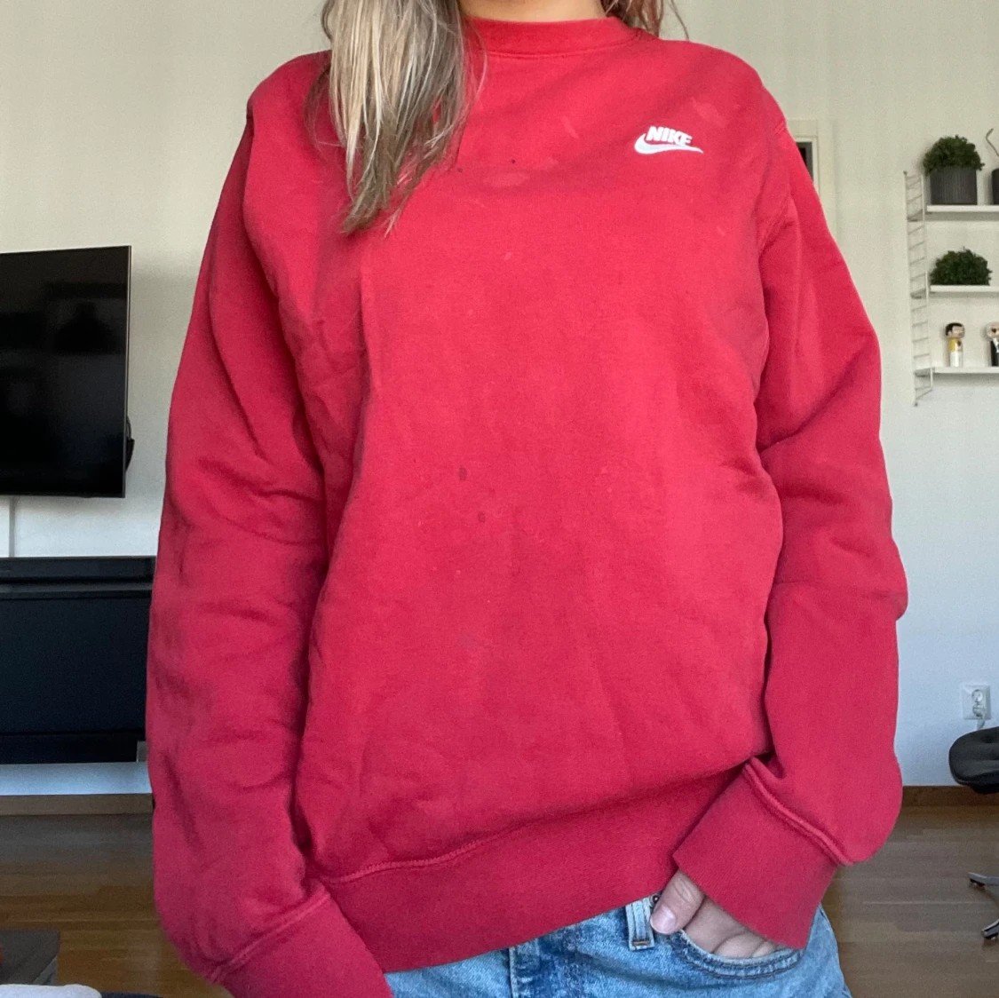 Säljer en röd sweatshirt från Nike med deras klassiska logga på bröstet. Tröjan har långa ärmar och en avslappnad passform, perfekt för en casual look. Den har några defekter framtill som syns på andra bilden men förutom det är den i bra skick☺️Den är i storlek Xs men skulle säga att den sitter som en S/M.