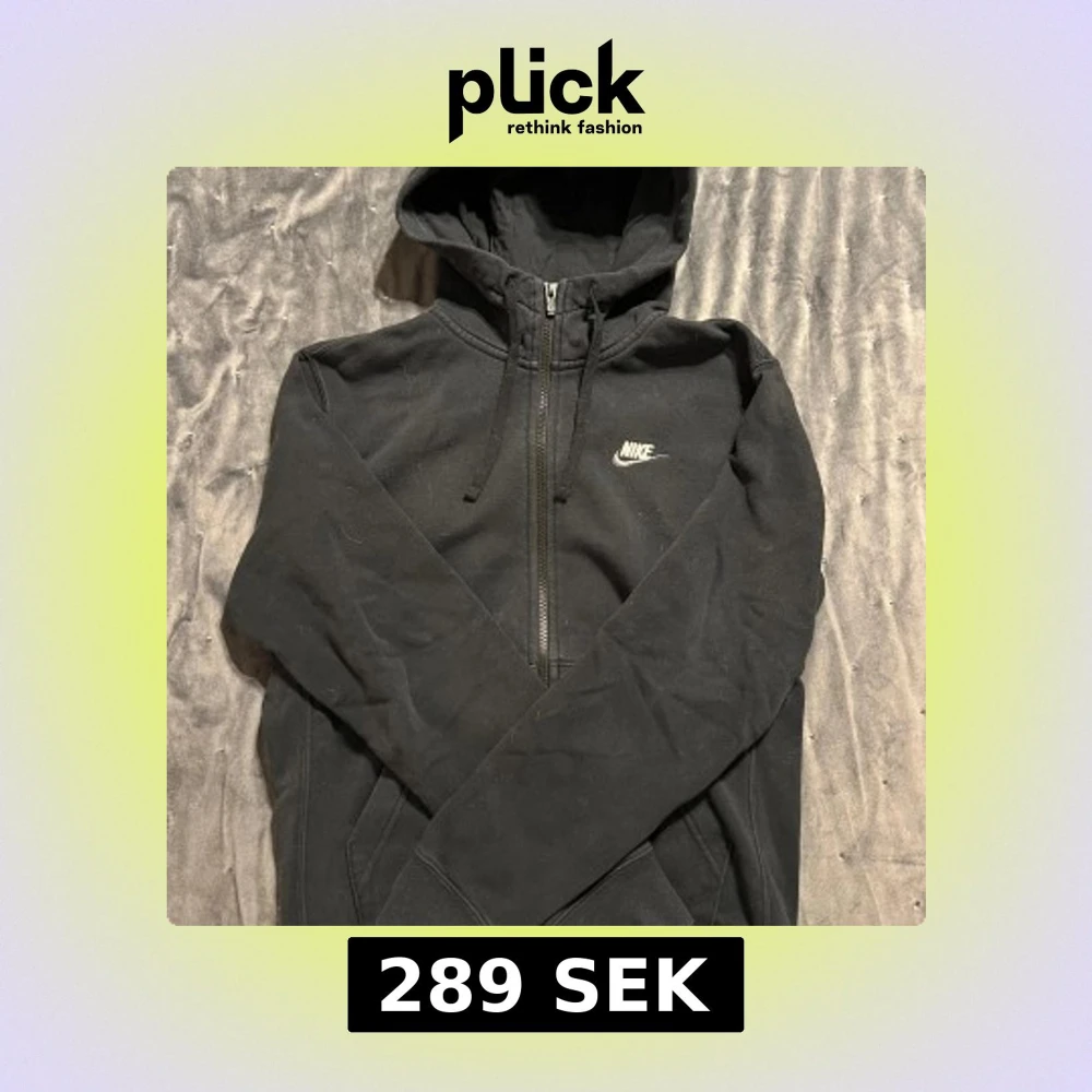 Säljer en svart hoodie från Nike med dragkedja och huva. Den har en klassisk design med Nike-logga på bröstet och är tillverkad i ett mjukt material för extra komfort.