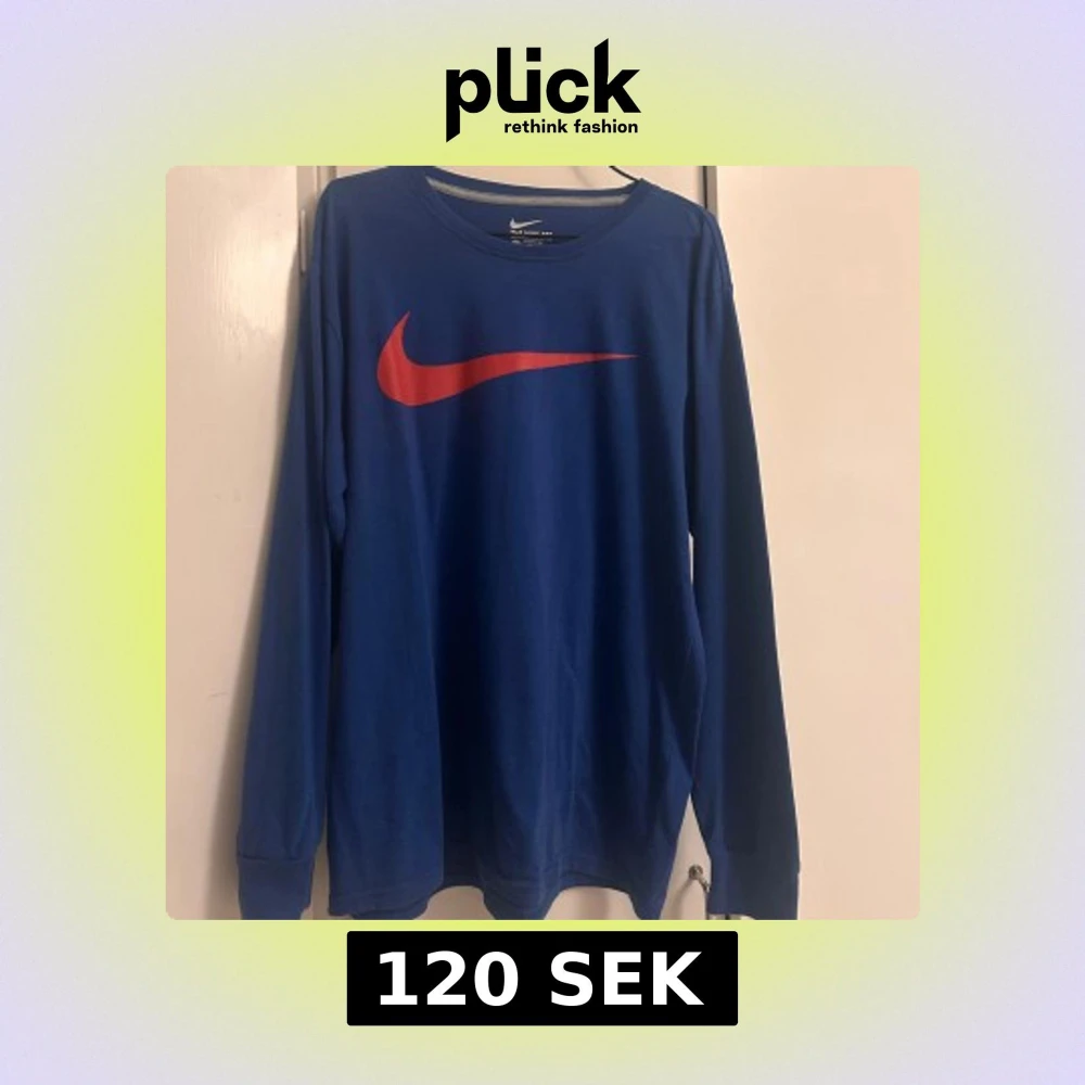 Blå långärmad tröja från Nike, det finns ingen logga där bak utan det är samma färg som tyget. Ett mjukt bomullsmaterial. Storleken är 2XL men sitter som en storlek L.