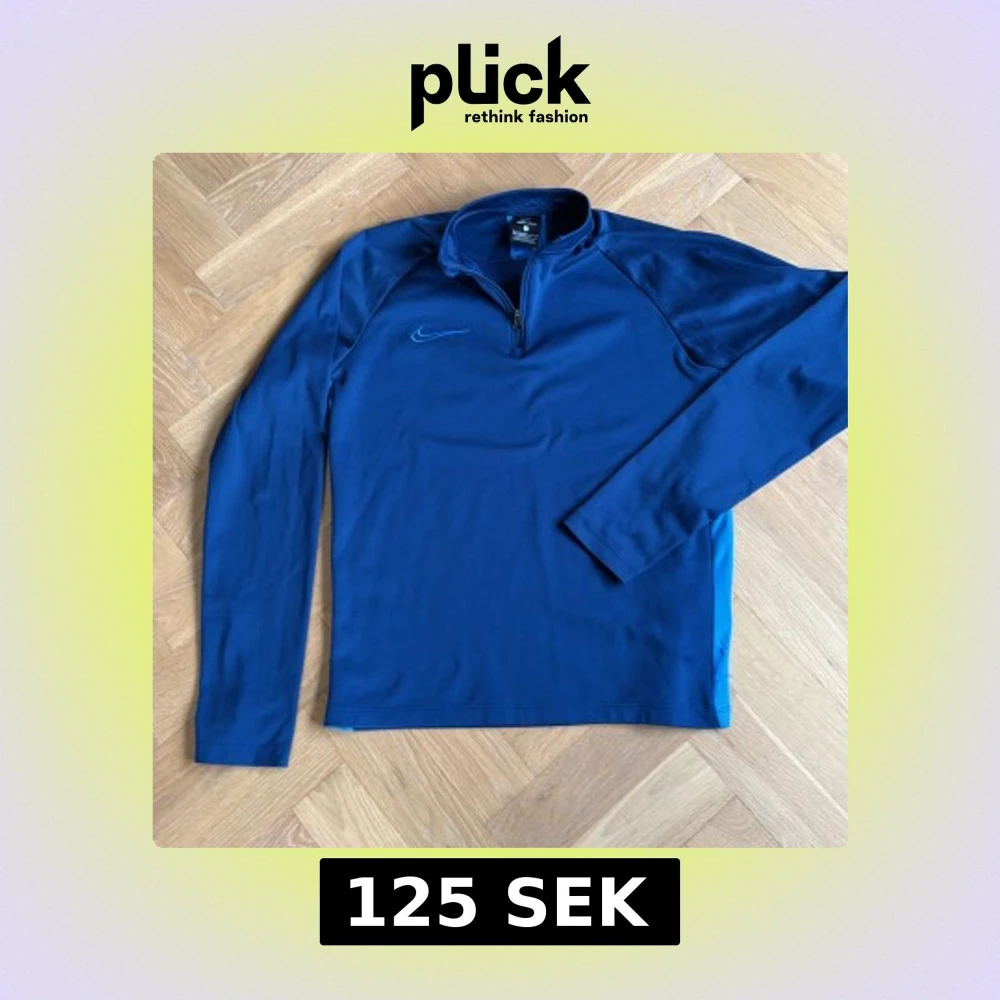 Nike Dri-Fit långärmad träningströja i marinblått med halv dragkedja och diskret logga på bröstet. Tillverkad i lätt och ventilerande polyester, perfekt för sport eller chill. Snygga ljusblå detaljer längs sidorna och i nacken.