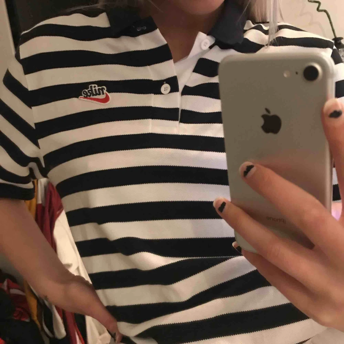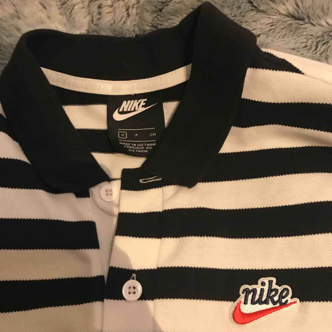 En svartvit randig piké i Nike,storlek S! Inte används alla mycket kanske 3-4 gånger!