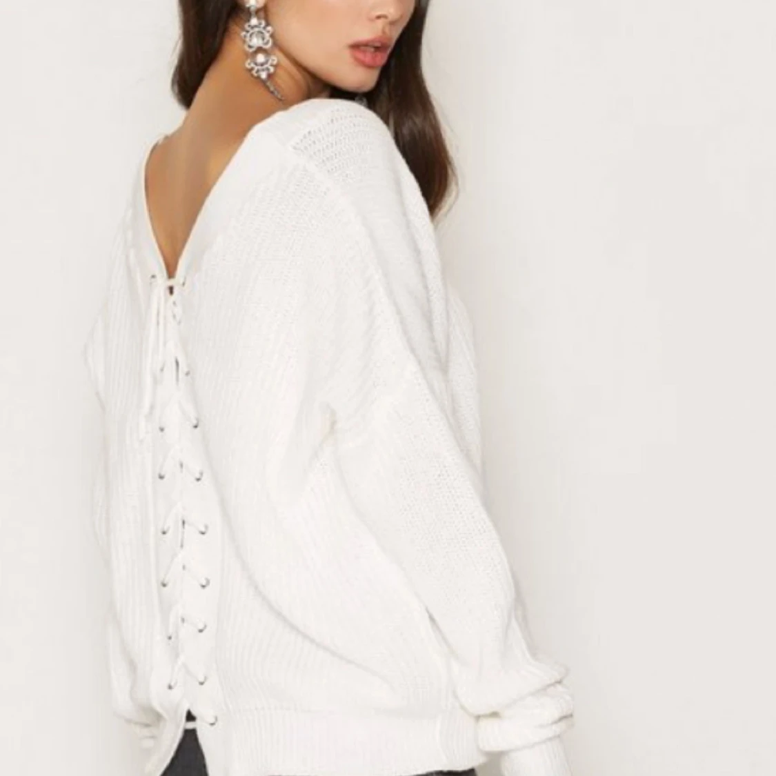 Stickad tröja från NLY Trend. Ribbad tröja med V-ringning framtill. Snörning baktill. Knappt använd. Frakt +30kr