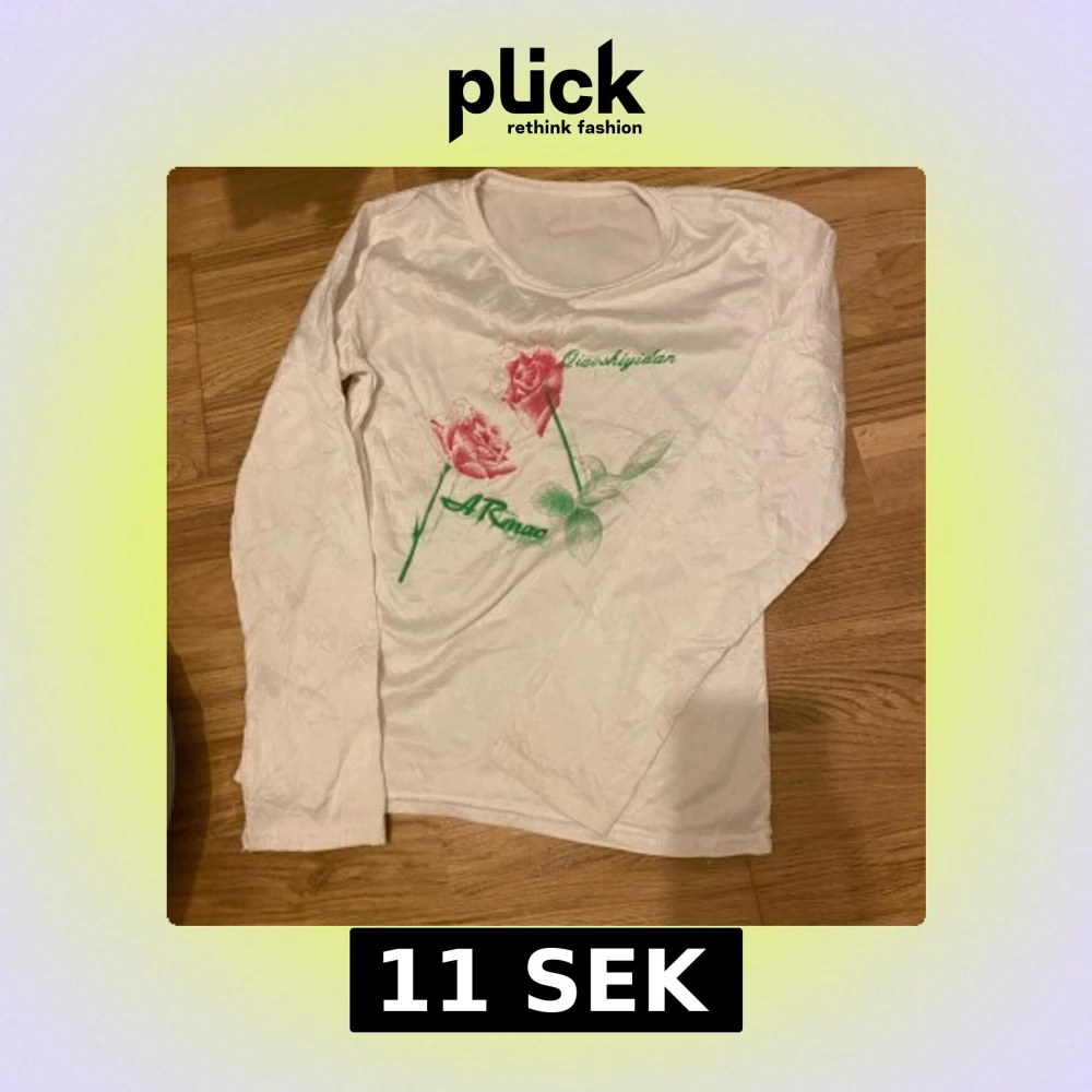 Säljer en vit långärmad tröja med tryck av två rosa rosor och gröna blad på framsidan. Tröjan är nästan som fleece material. Ingen strl står.
