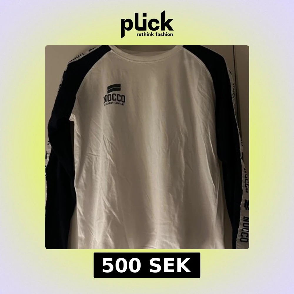 Säljer en långärmad tröja från NOCCO i vitt med marinblå ärmar och tryck längs axlarna. Tröjan har rund halsringning och är gjord i 100% bomull. Perfekt för dig som gillar sportig och clean stil.