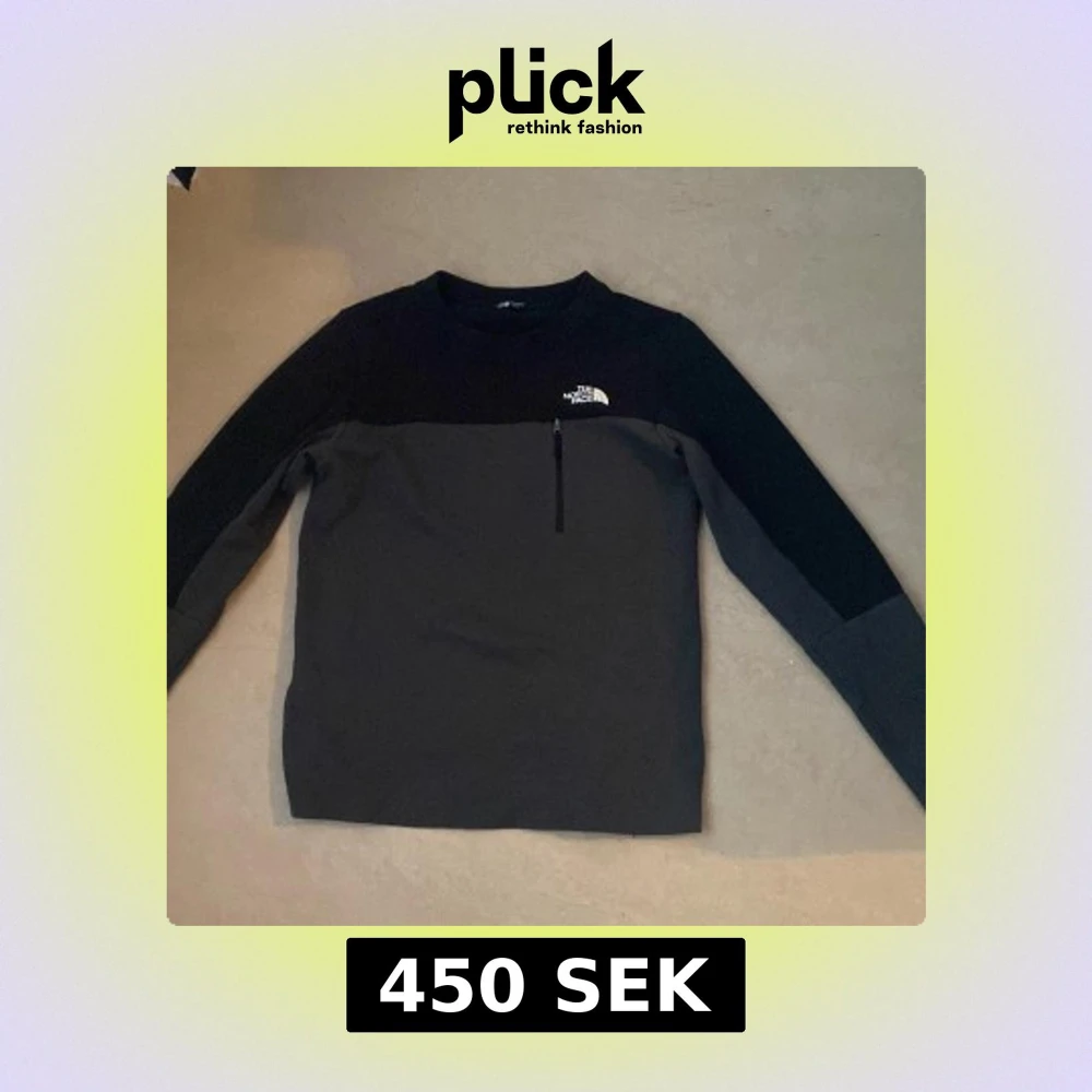 en svart och grå tröja från North Face. Tröjan har en praktisk dragkedja på bröstet och är långärmad. Perfekt för kyligare dagar.