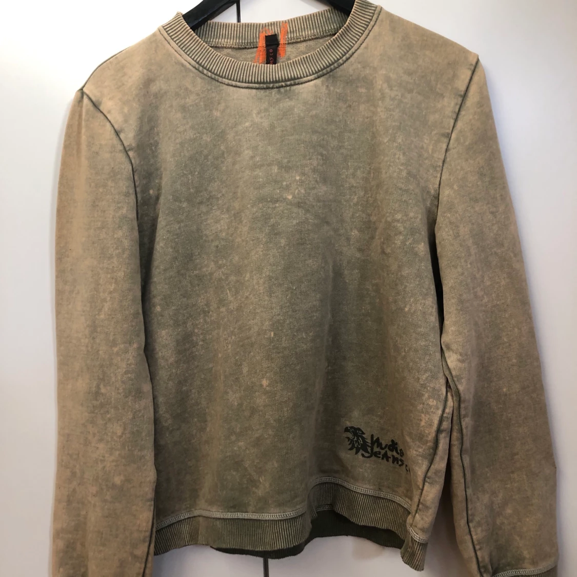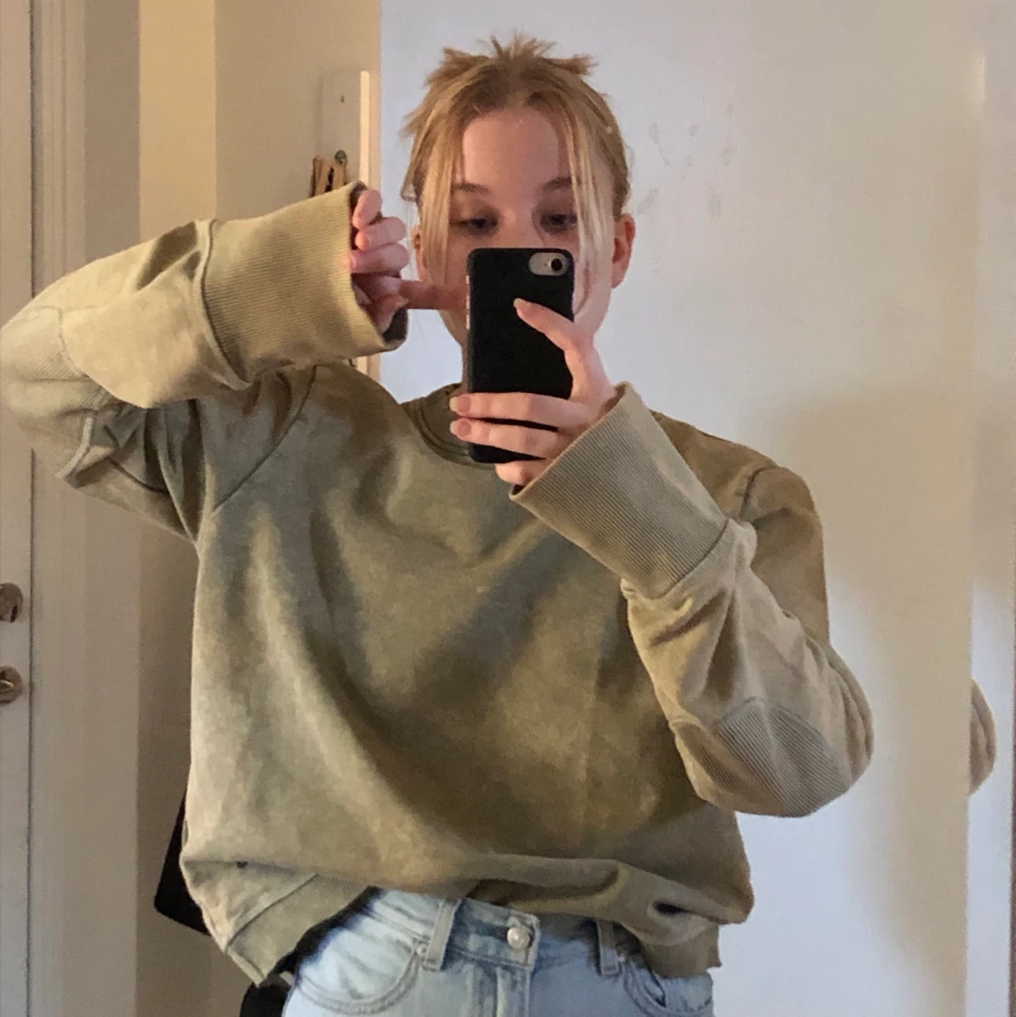 Lite speciell stil, vintage med coola lappar på armbågarna. Långa ärmar, har själv croppat nedre mudden då den va väldigt bred.