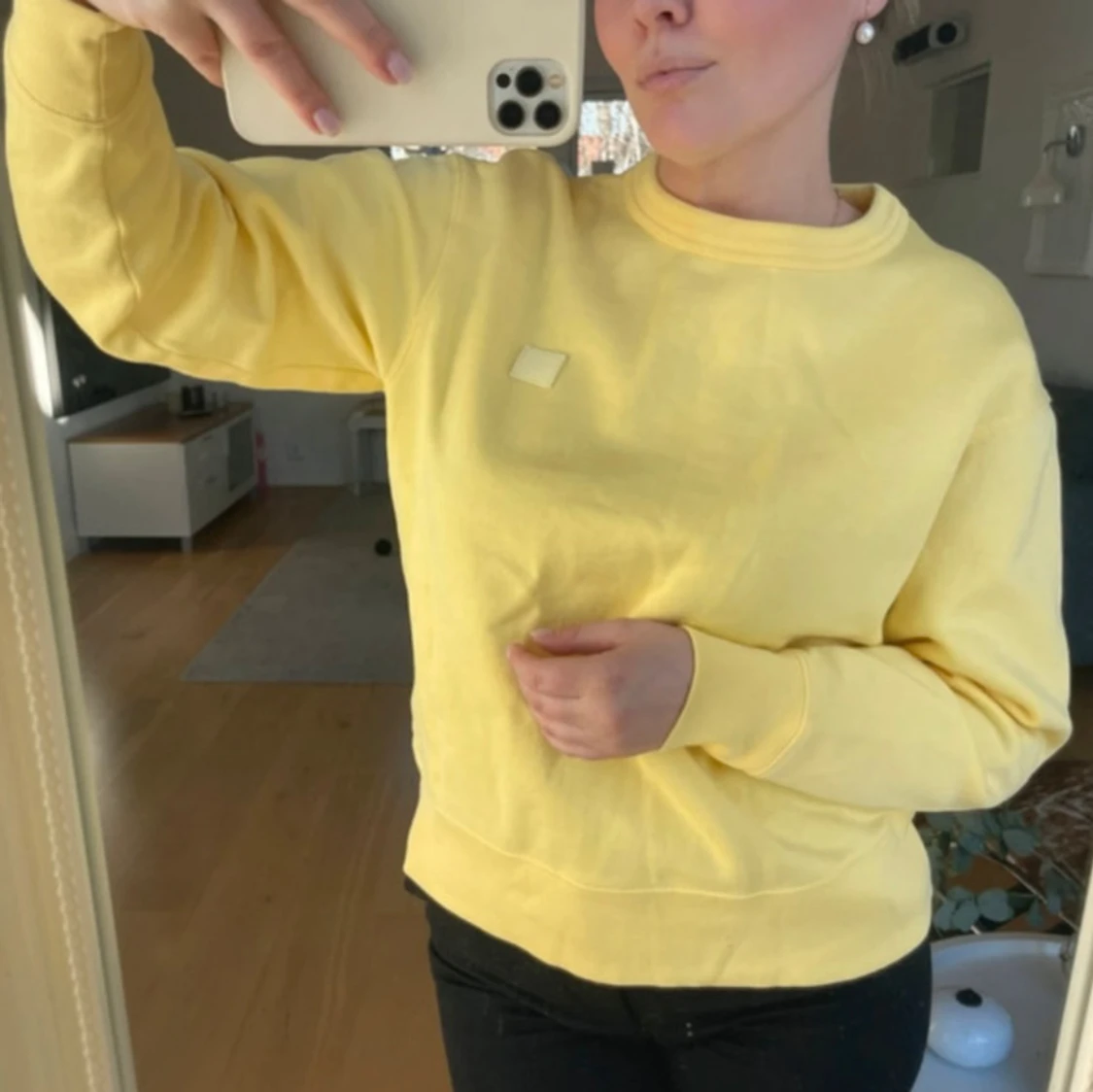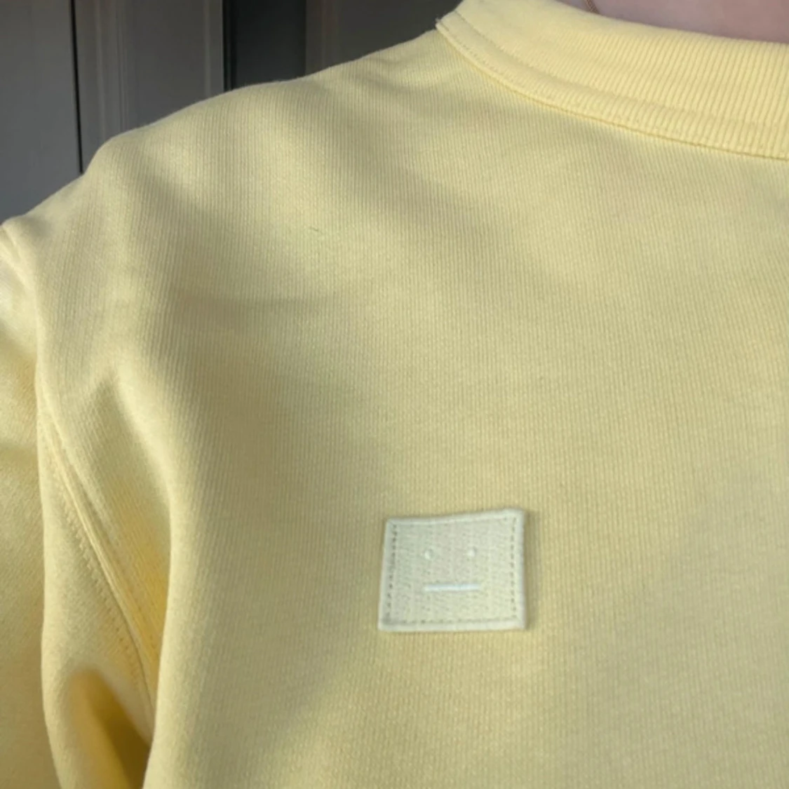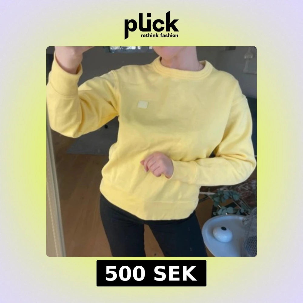 Säljer en gul sweatshirt från Acne Studios med en liten fyrkantig logga på bröstet. Tröjan har en rund halsringning och långa ärmar.