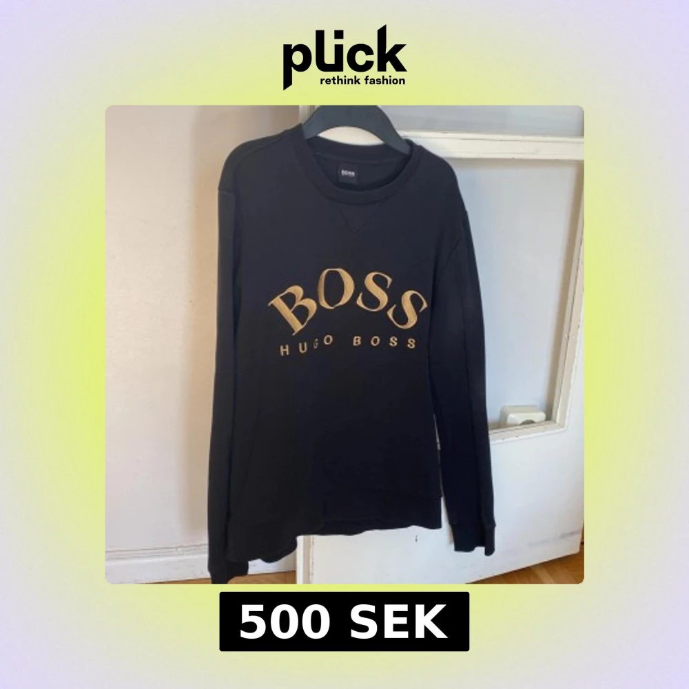 Säljer en stilren svart tröja från Hugo Boss med deras ikoniska logga i guld på bröstet. Tröjan har långa ärmar och en klassisk rund halsringning. Perfekt för en avslappnad men ändå elegant look👍🏻
