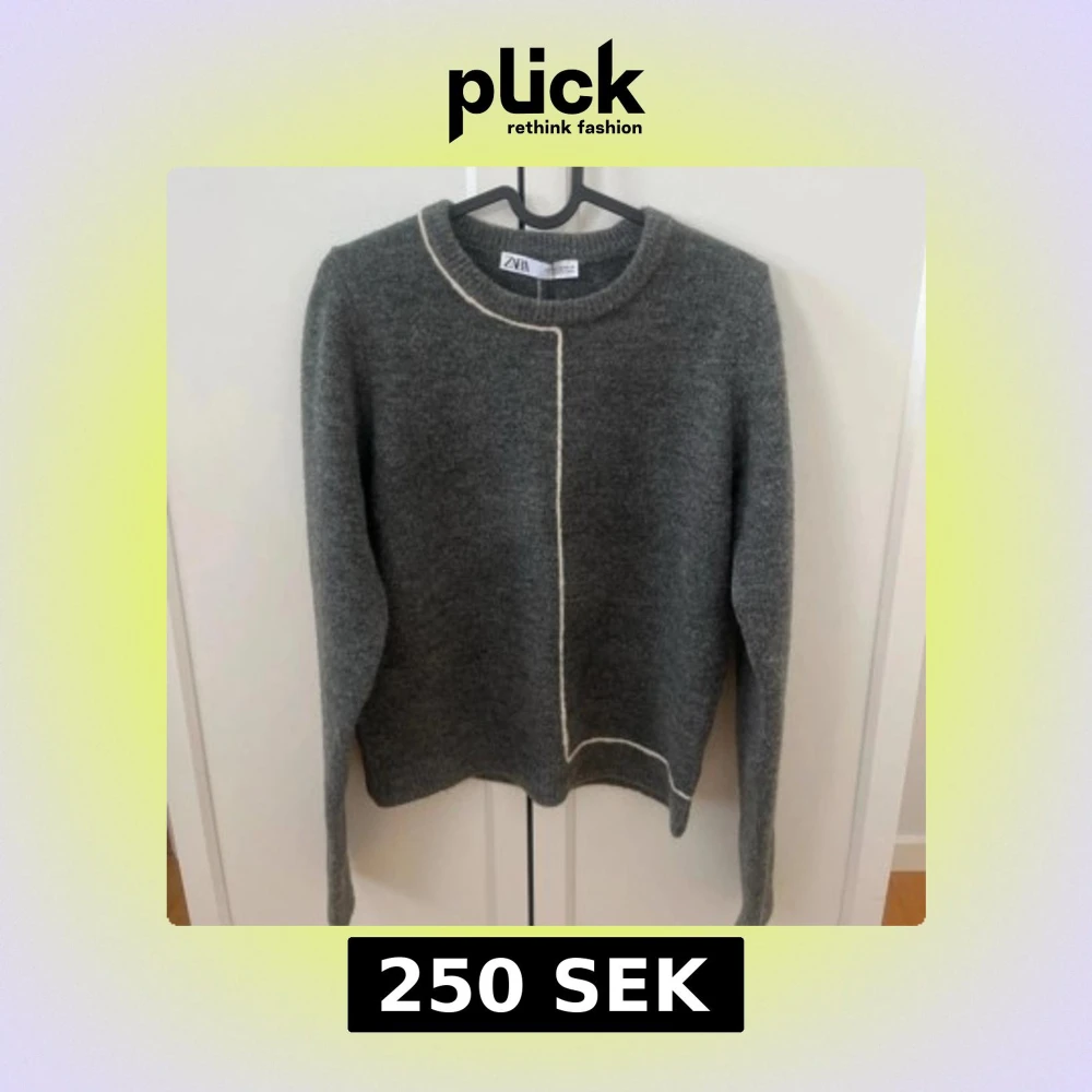 Mysig grå stickad tröja från Zara med vit kontrastsöm som går längs framsidan och bak. Rund halsringning och långa ärmar. Helt ny med prislapp kvar, storlek M men sitter som S då den har lite ”slim fit”. Priset går att diskutera.