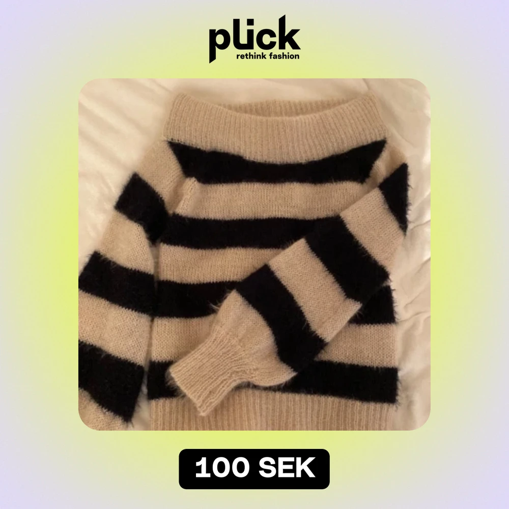 En stickad tröja som är offshoulder och randig, svart och beige. Aldrig använt, passar både S och M skulle jag nog säga.