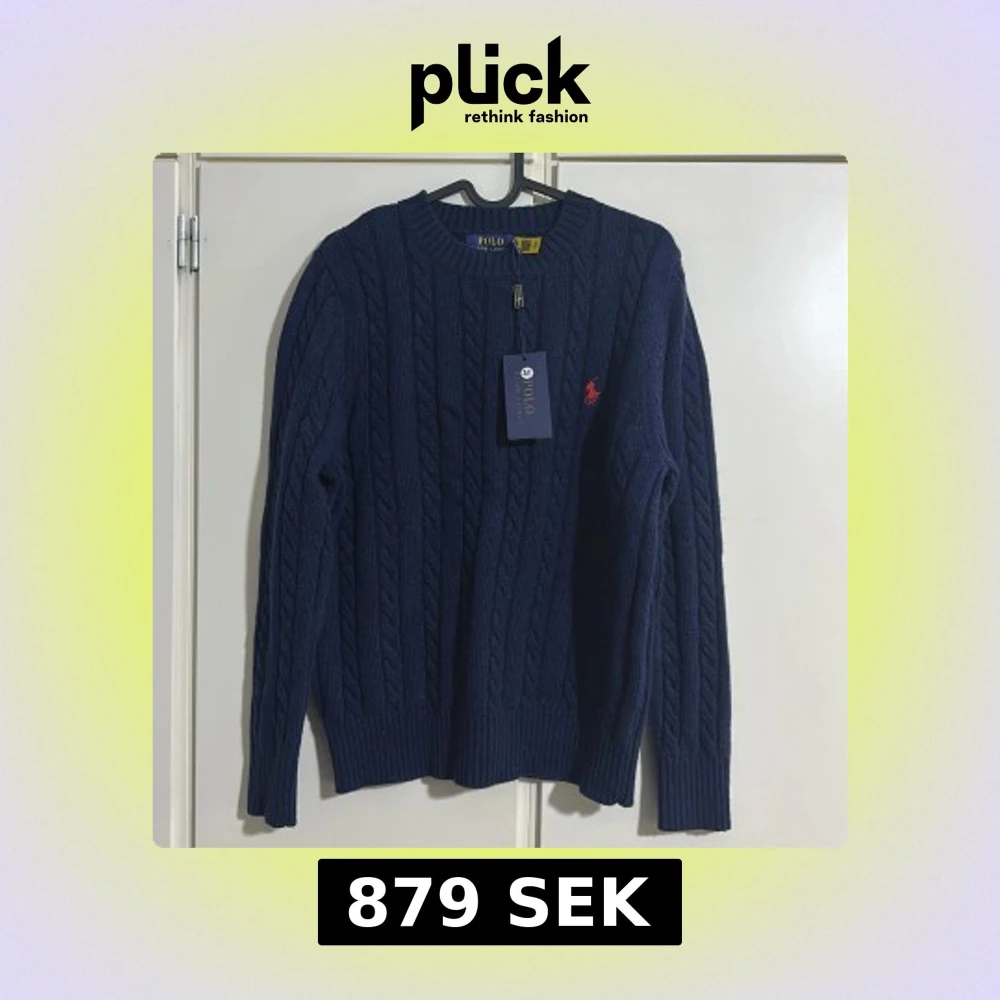 Säljer en stilren mörkblå stickad tröja från Ralph Lauren med det klassiska röda logotypbroderiet på bröstet. Tröjan har en kabelstickad design och långa ärmar, perfekt för kyligare dagar.