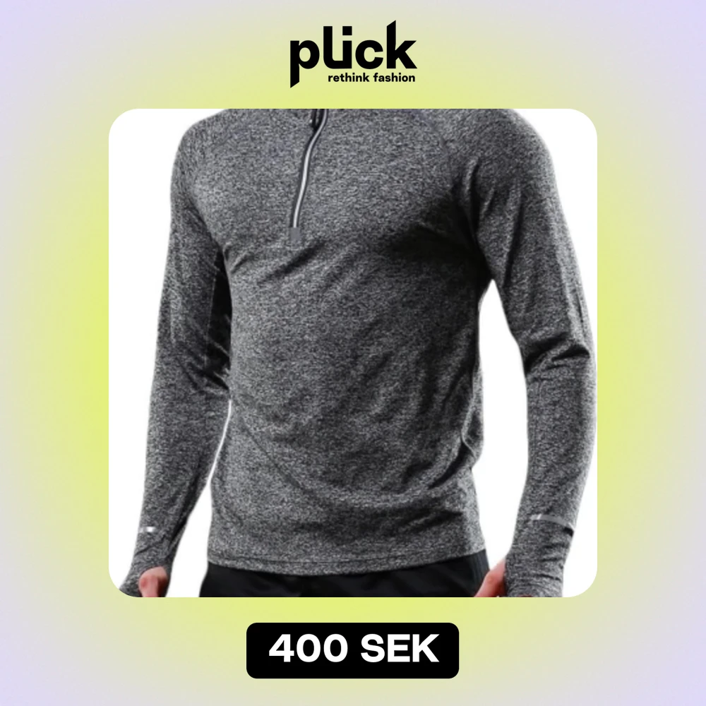 En grå långärmad tröja med dragkedja framtill. Tröjan har en huva och är tillverkad i ett bekvämt material som passar bra för träning.