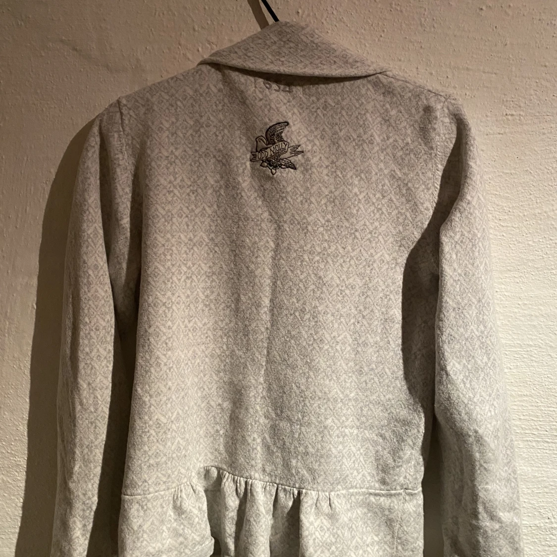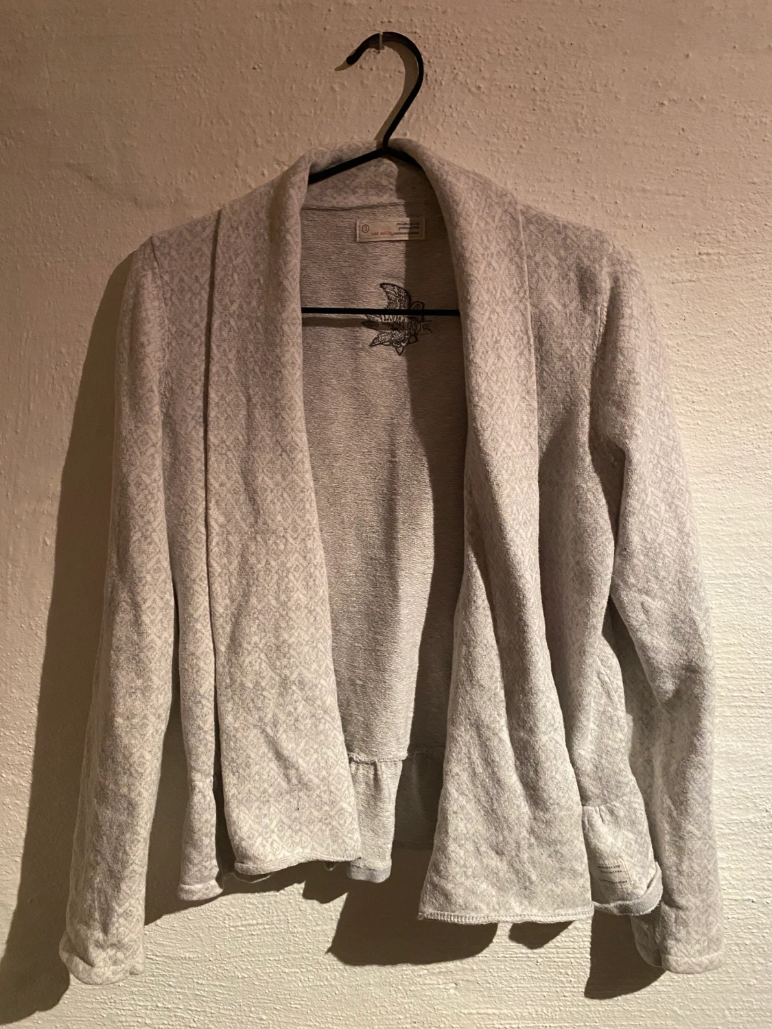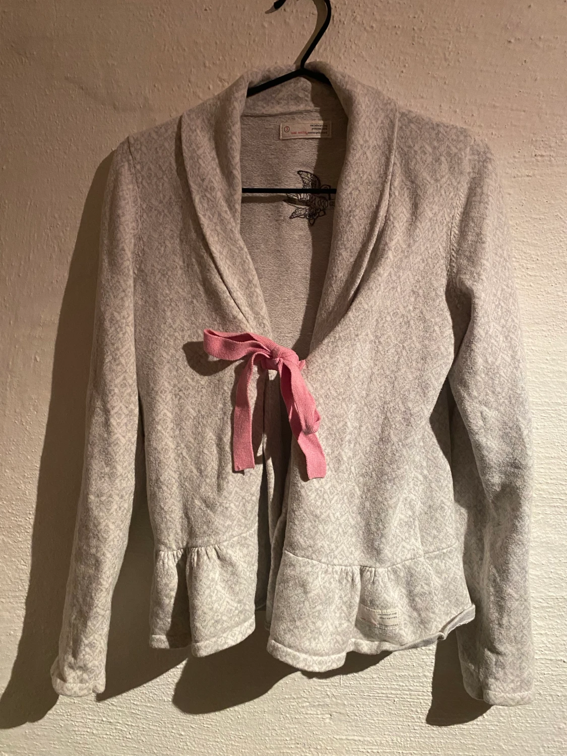 En urfin grå kofta som är så fin till våren. Den är jättefin att ha öppen men också att knyta åt. Och så har den dinna fina odd molly detaljer över sig. Så fin!!