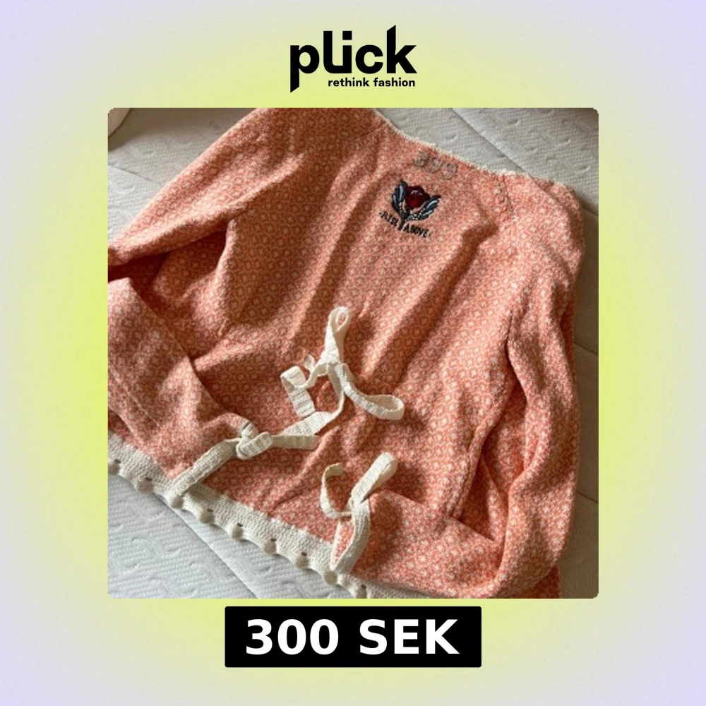 Säljer en söt orange kofta från Odd Molly med ett broderat motiv och texten 'Rise Above'. Koftan har knytband framtill och vita detaljer vid ärmslut och nederkant. Perfekt för en avslappnad stil med en touch av unik design. 🌸