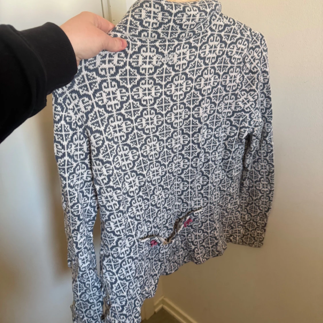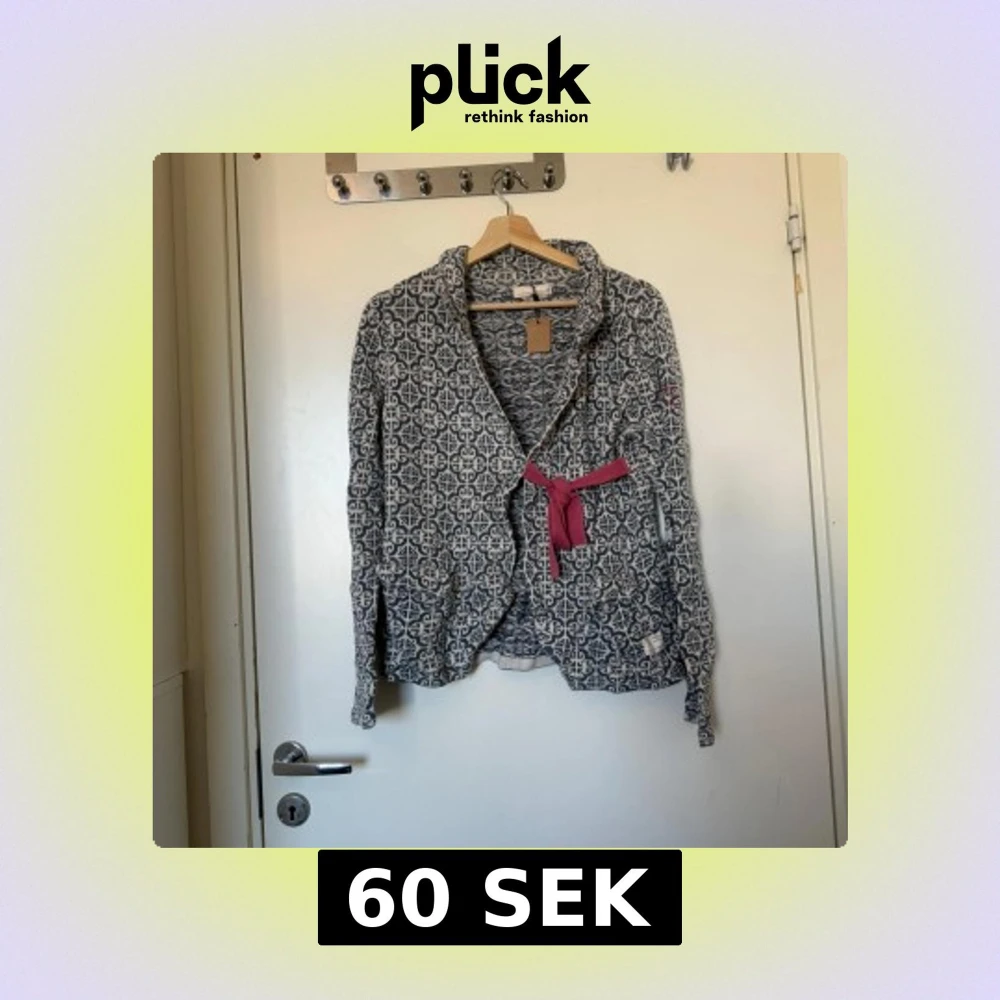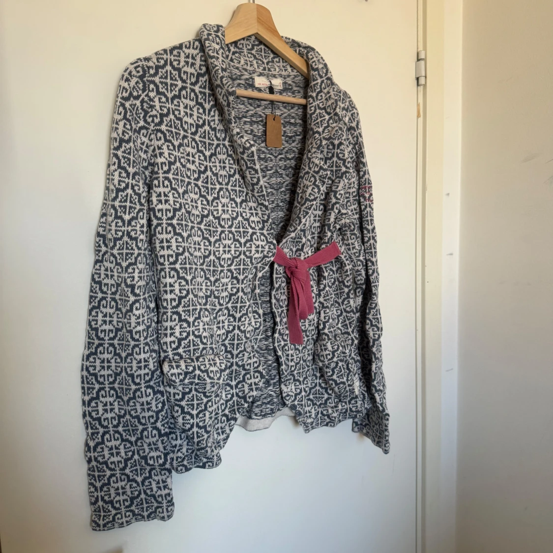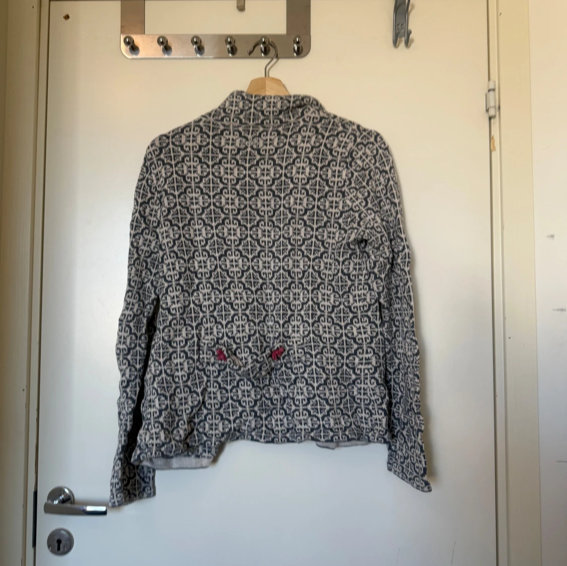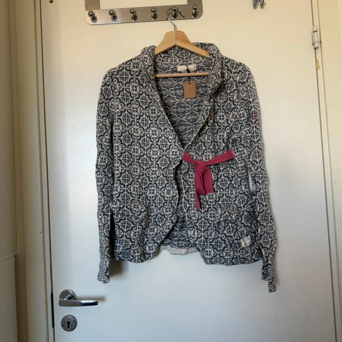 Säljer en snygg kofta från Odd Molly i blått och vitt med grafiskt mönster. Koftan har ett rosa knytband i midjan, långa ärmar och mjukt stickat material. Perfekt för dig som gillar unika detaljer och vill ha något extra till garderoben. Storlek 2 som enligt deras storleksguide motsvarar en storlek M. Fint skick, men har små tecken på användning.