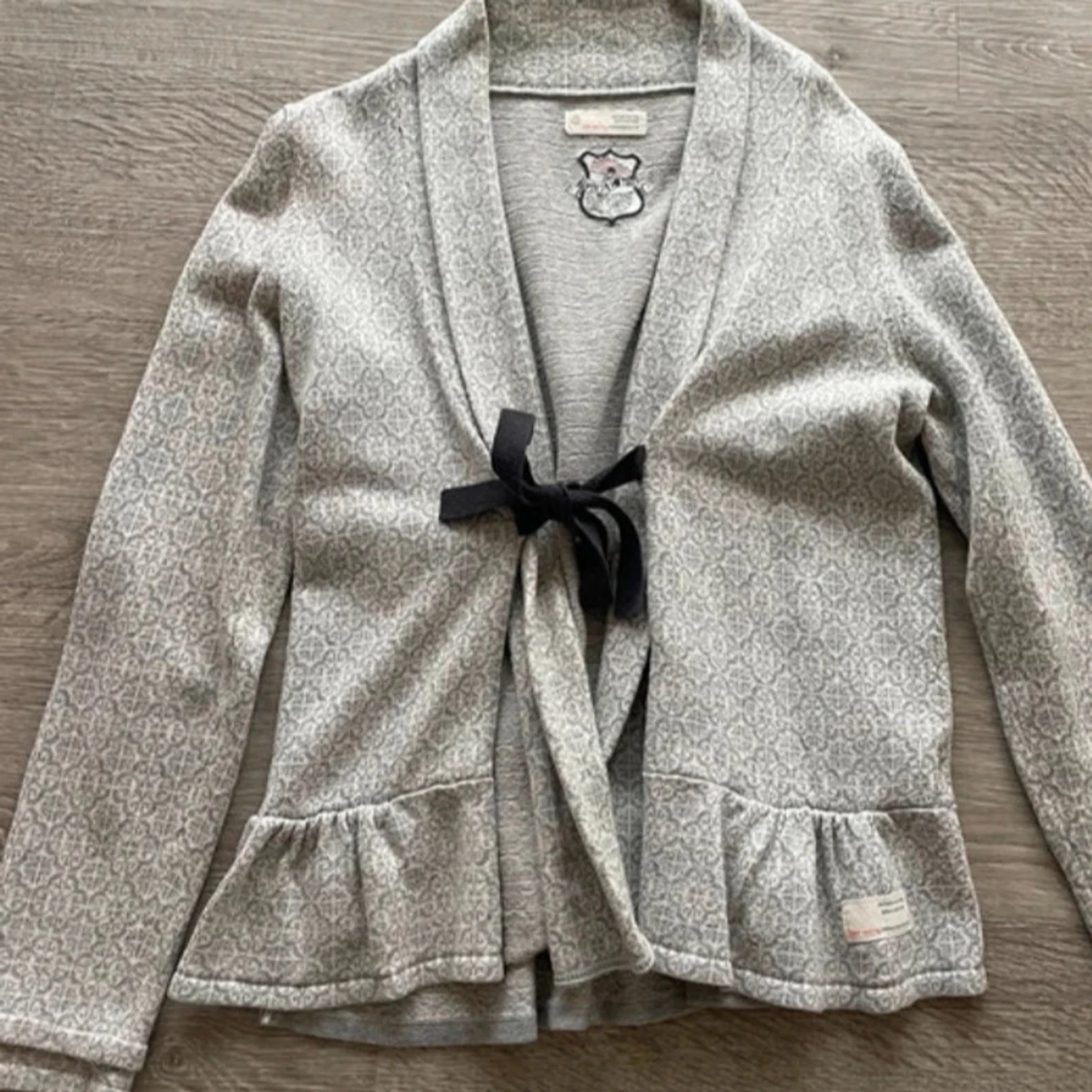 Säljer en snygg grå kofta från Odd Molly med ett diskret mönster och volangdetaljer vid nederkanten. Koftan har långa ärmar och knyts med ett svart band framtill. Perfekt för en stilren look.