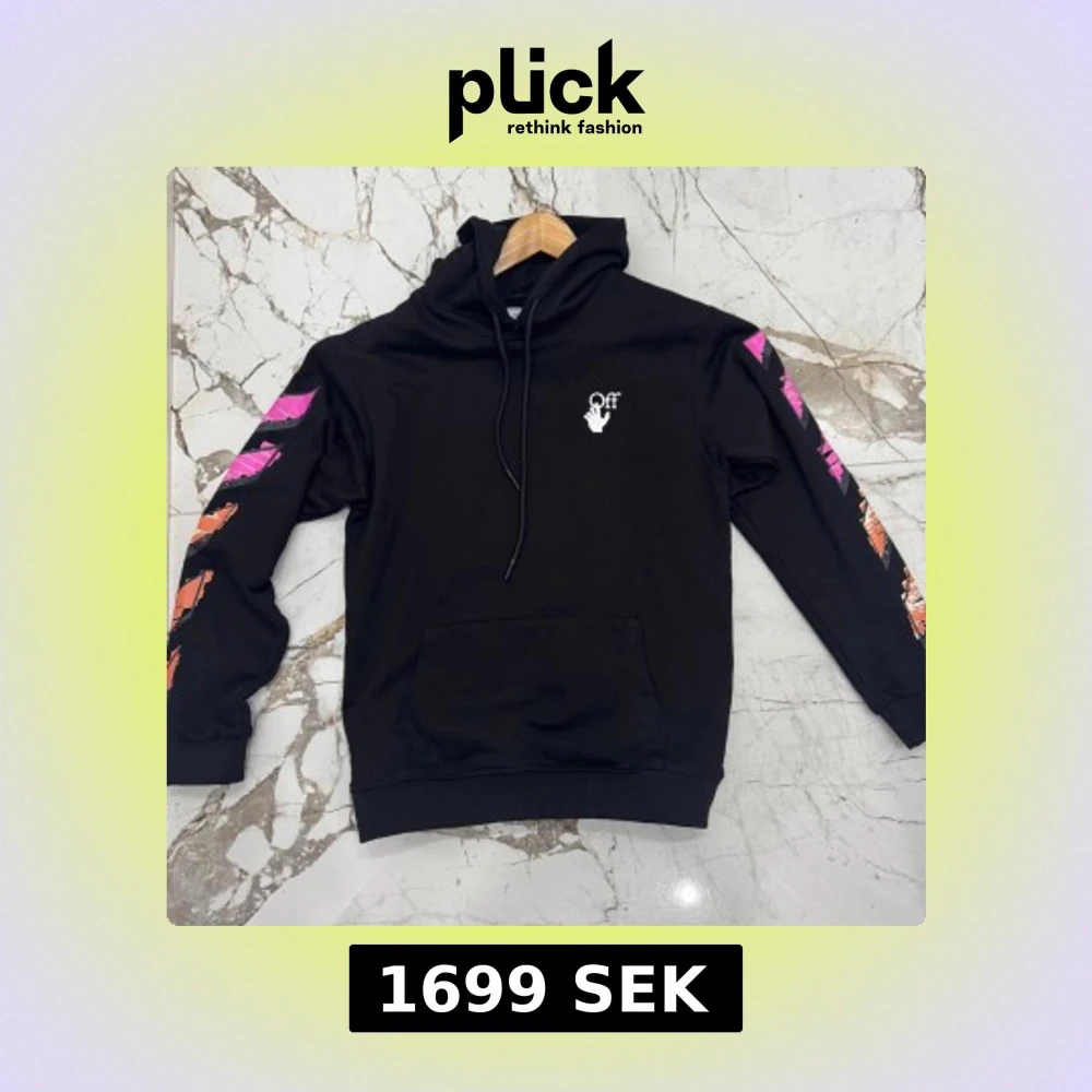Svart hoodie från Off-White med huva och snörning. Stora grafiska tryck i rosa och orange på ärmar och rygg, samt vit logga på bröstet. Känguruficka framtill och ribbade muddar. Tillverkad i mjuk bomull för maximal komfort.