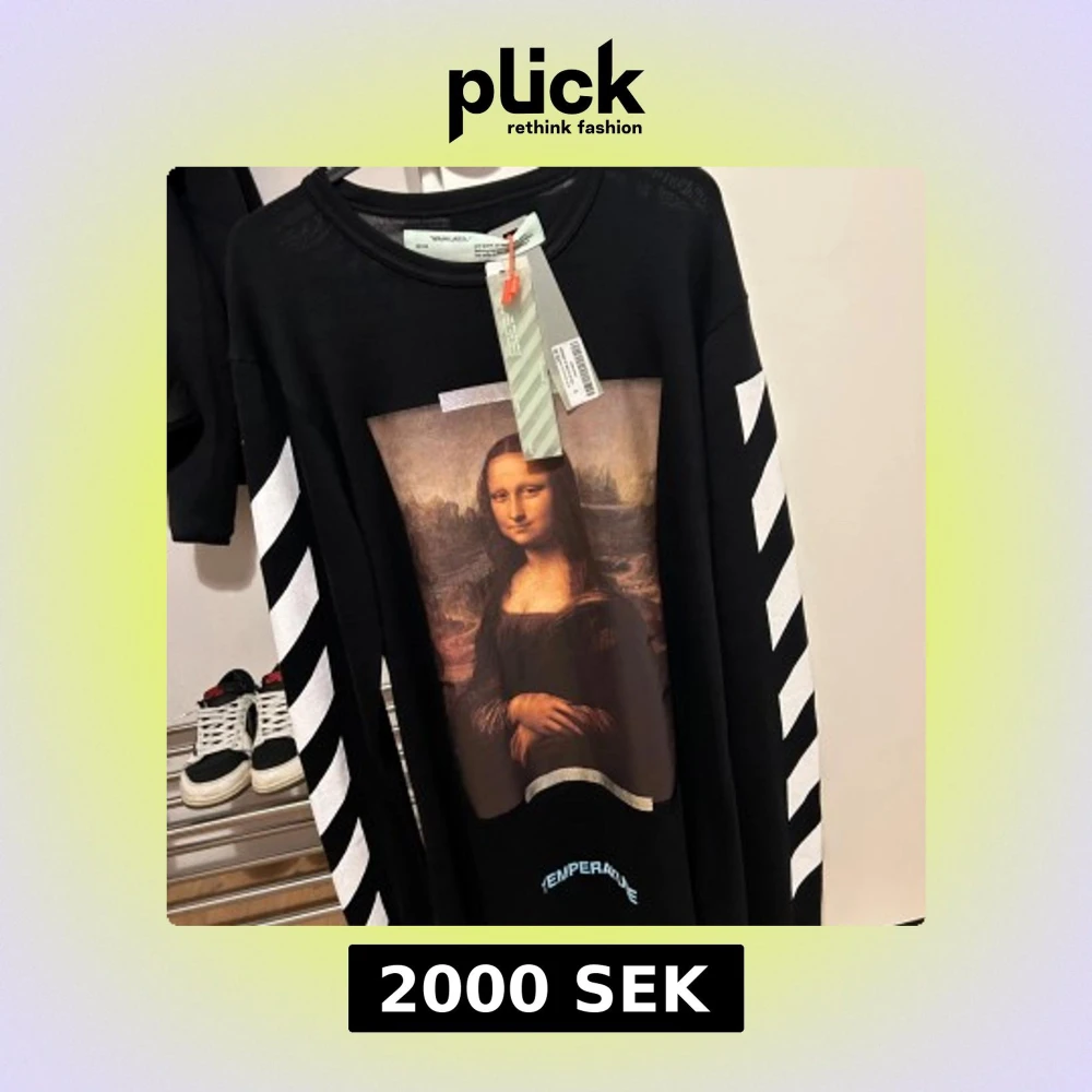 Säljer en svart långärmad tröja från Off-White med ikoniskt Mona Lisa-print på framsidan och stora vita pilar på ryggen. Ärmarna har vita diagonala ränder och texten 'TEMPERATURE' i blått nedtill.