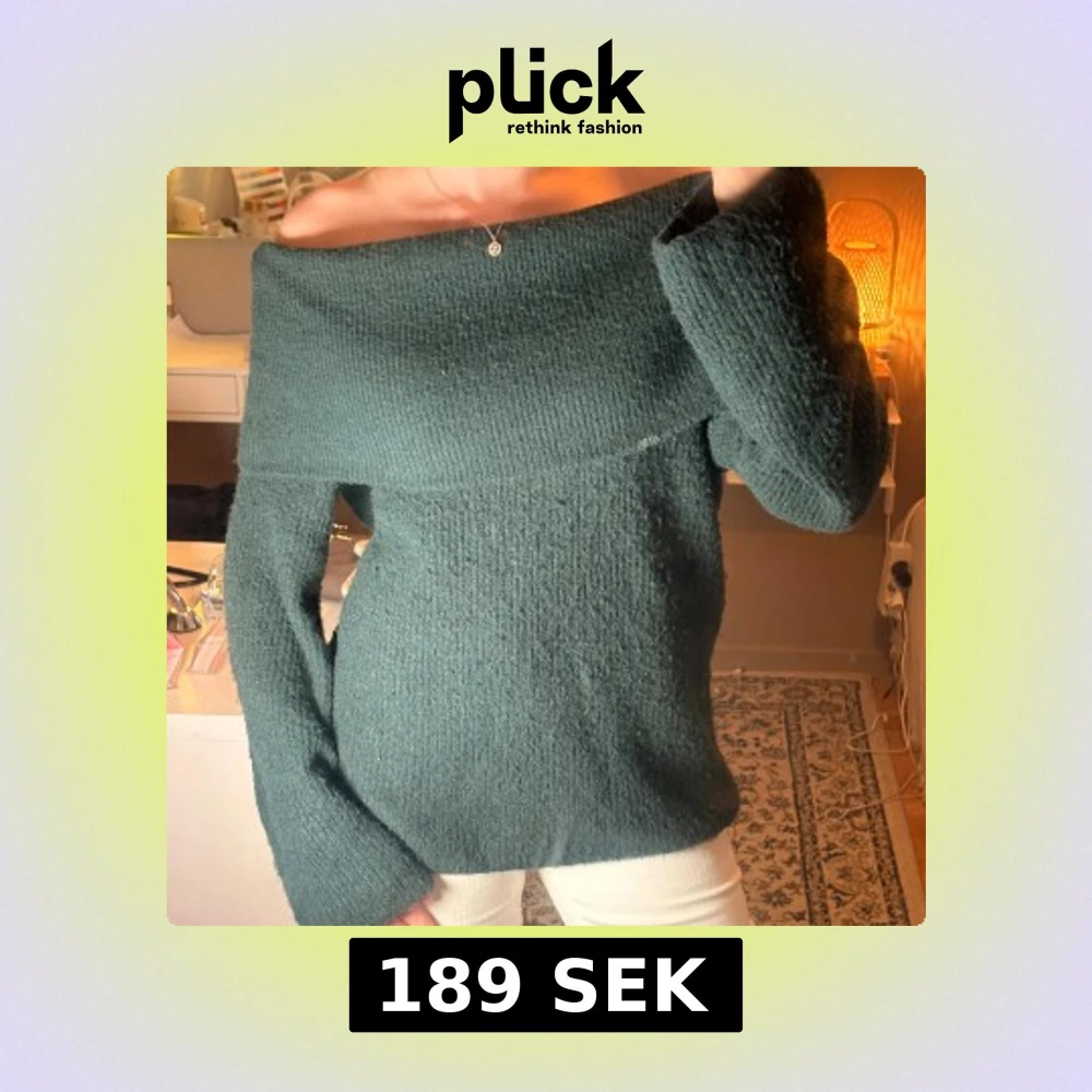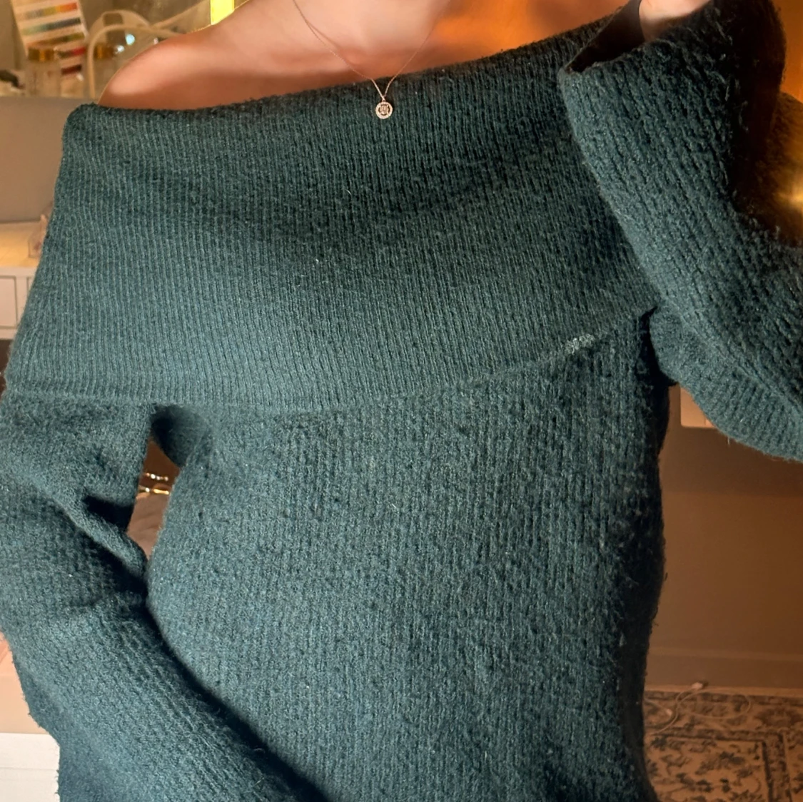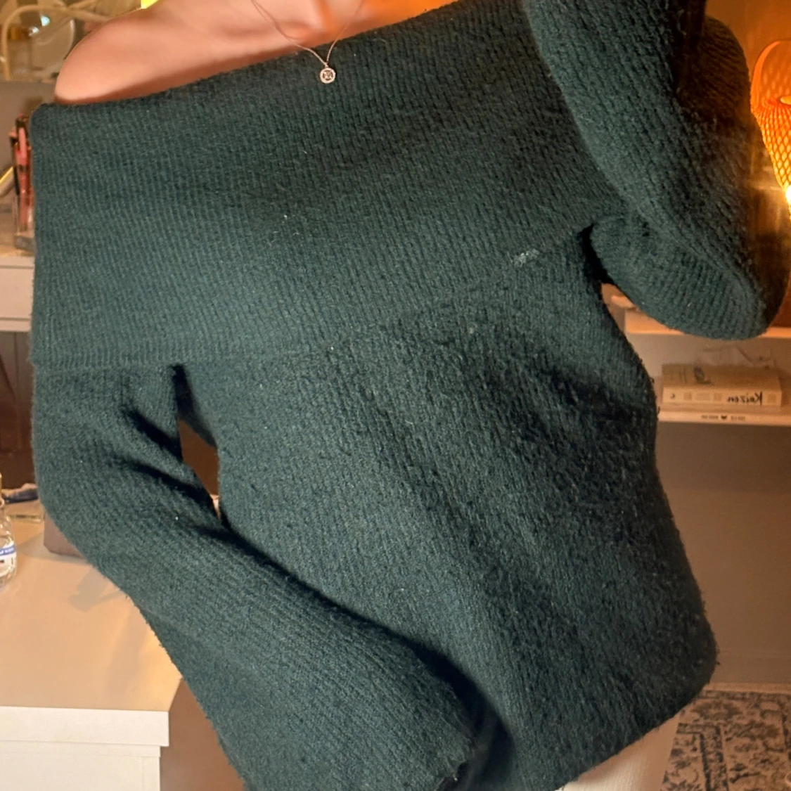 Mysig mörkgrön stickad tröja från H&M med offshoulder-design och långa ärmar. Tröjan har en bred krage som vilar snyggt över axlarna och en loose passform. Perfekt för kyliga dagar när du vill vara både bekväm och stilren.