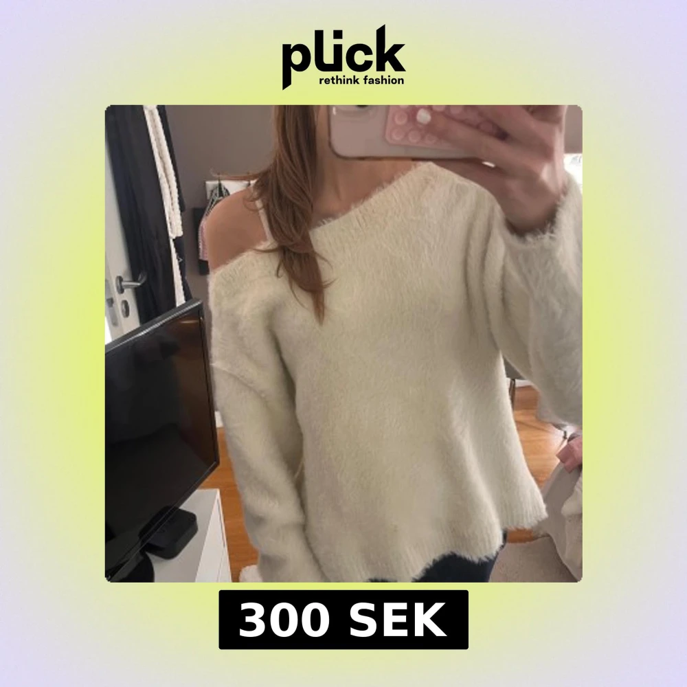 Supermjuk och fluffig vit tröja från H&M med offshoulder-design. Tröjan har lång ärm och en loose passform, perfekt för dig som gillar en avslappnad och trendig stil. Materialet är mysigt och ger en lyxig känsla.
