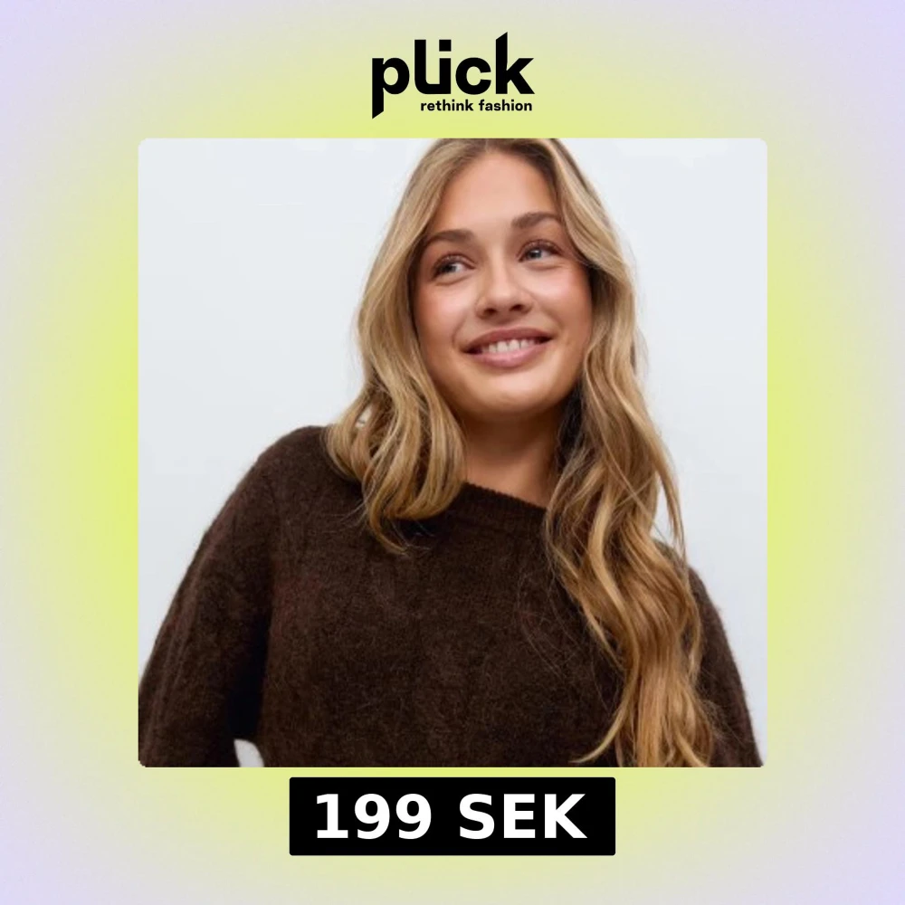 Mysig mörkbrun stickad tröja med klassiskt kabelstickat mönster och off shoulder. Aldrig andvänd