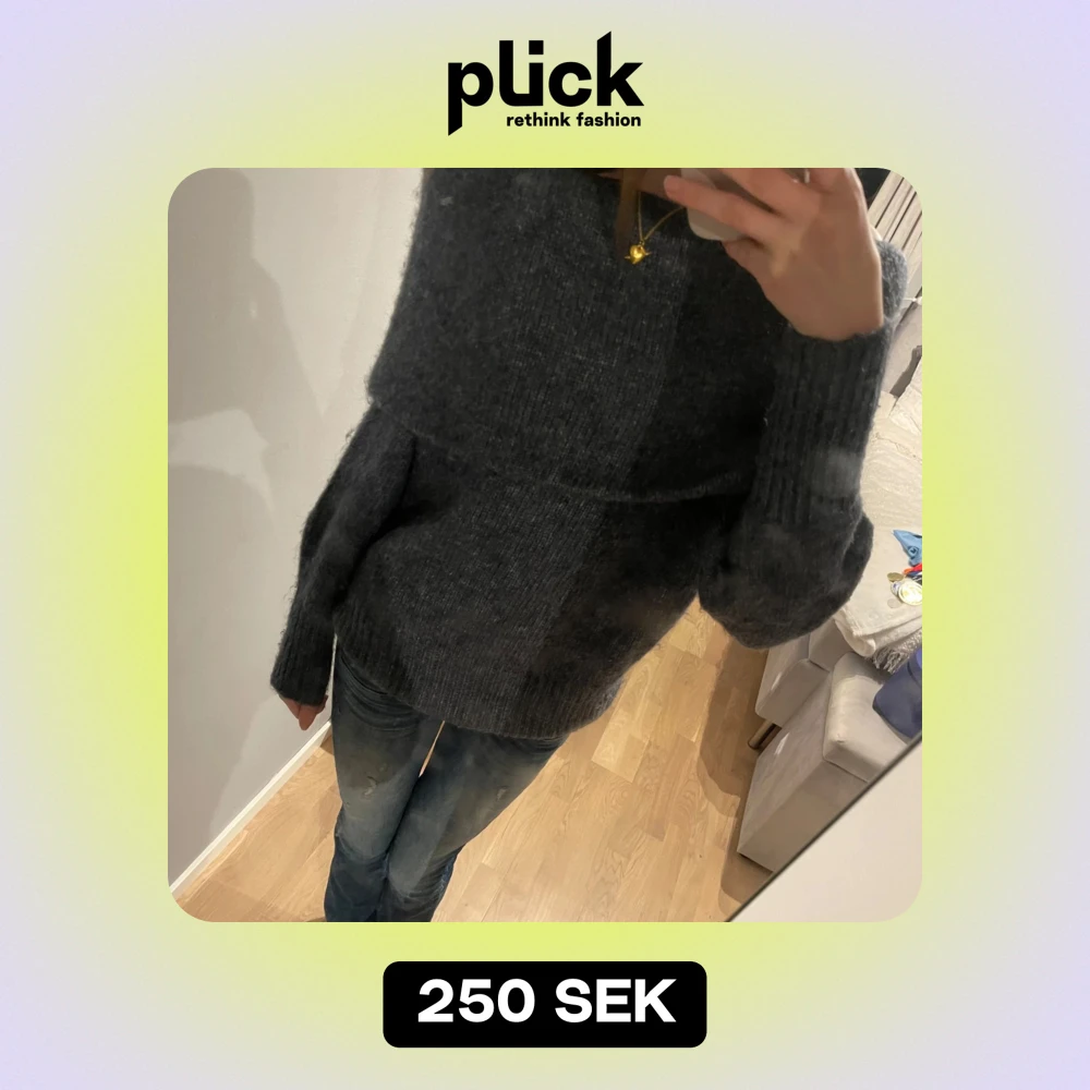 Säljer en supermysig mörkgrå stickad tröja med offshoulder-design. I storlek M men har en lika dan i en annan färg i storlek S och sitter nästan exakt lika. Perfekt för vintern eftersom den är väldigt varm och mysig