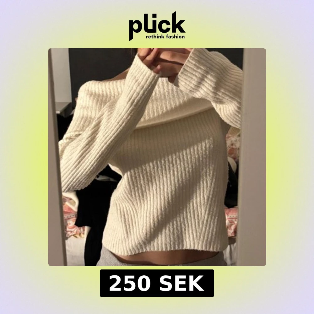 Säljer en vit ribbad offshoulder-tröja med lång ärm. Tröjan är croppad och har en mjuk, stickad känsla. Perfekt för dig som vill ha en stilren och trendig look.