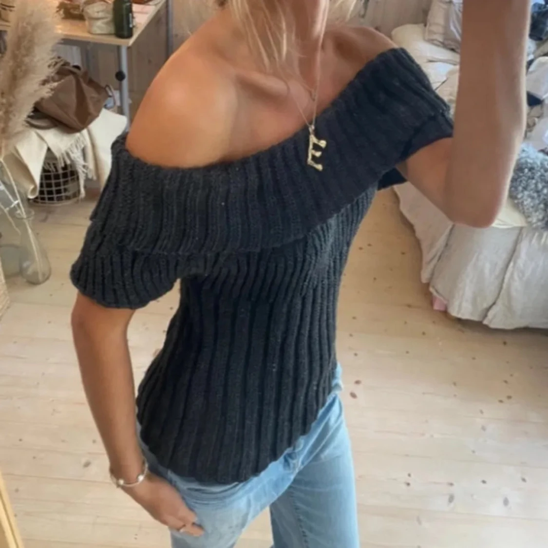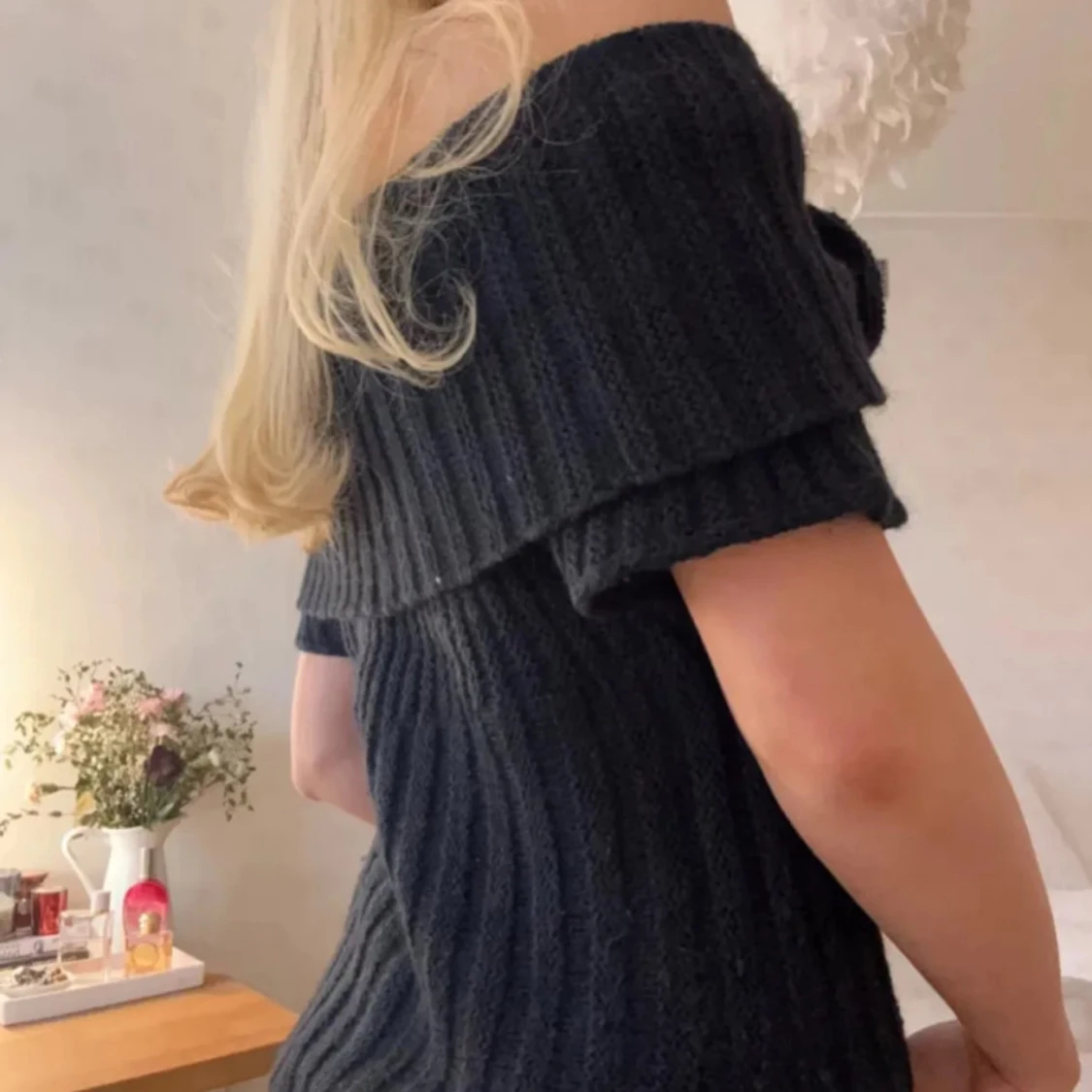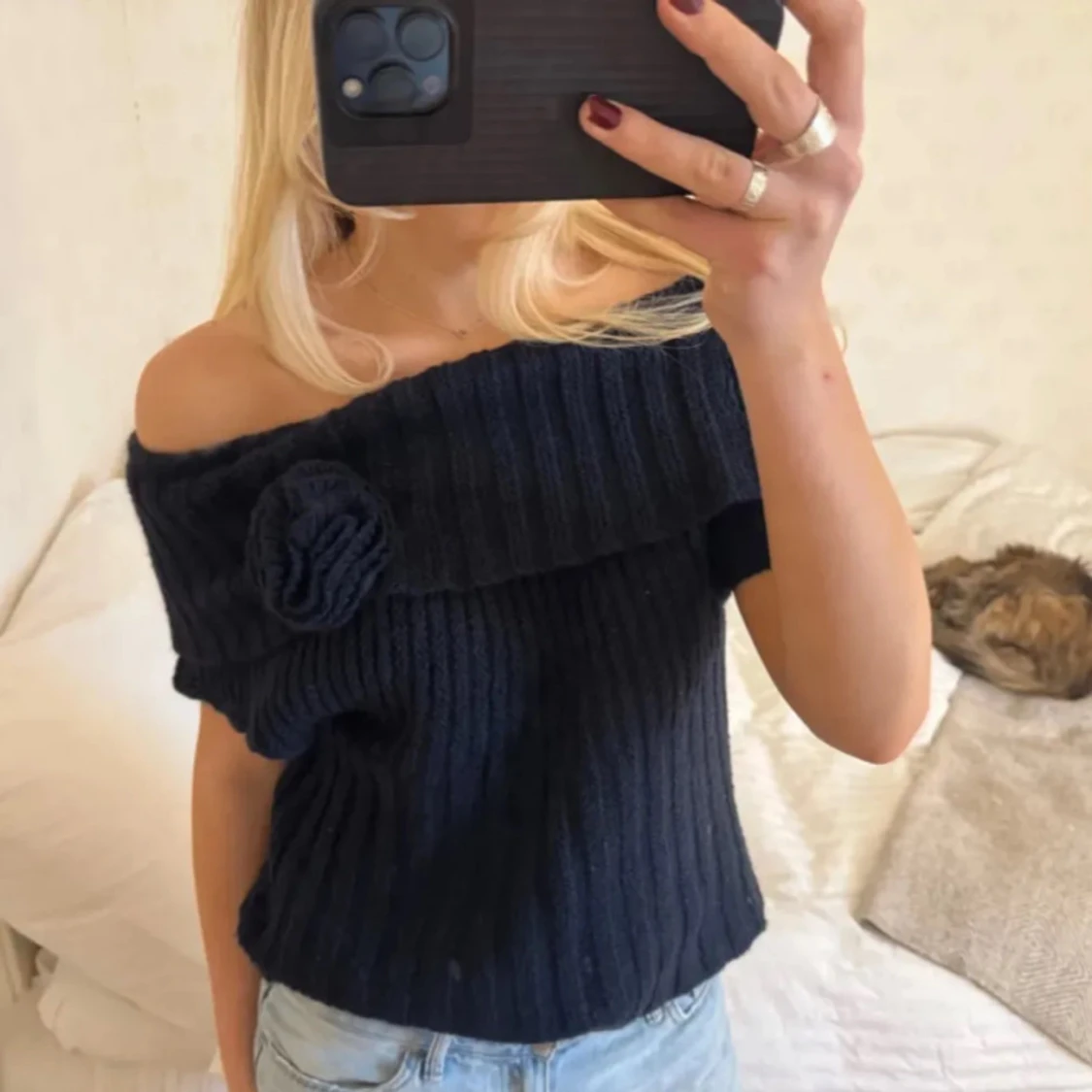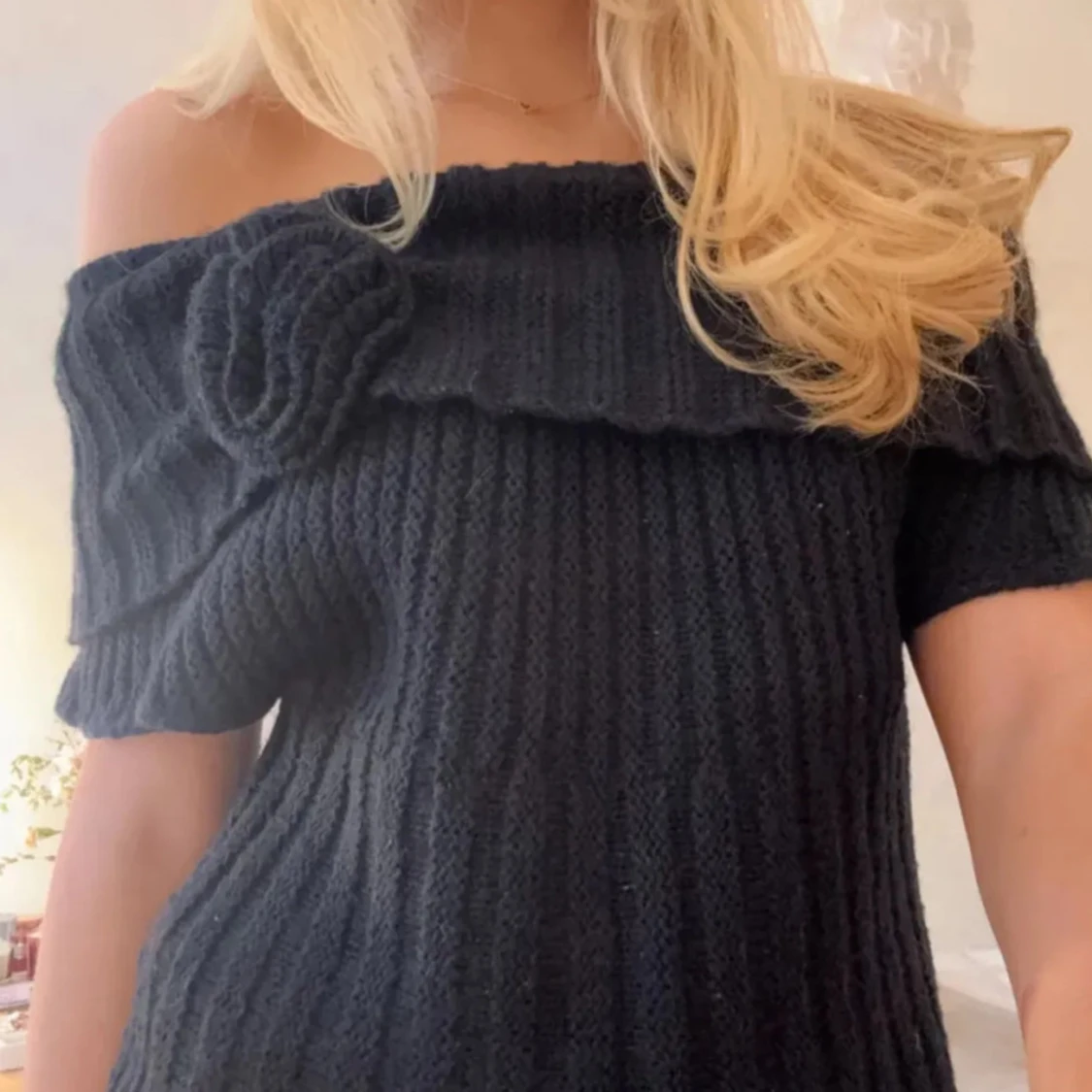 Suuuuuper snygg och skön svart stickad offshoulder topp som är kortärmad som man kan styla på olika sätt! Den dekorativa stickade blomman tillkommer och går att ta bort om man vill💘😊 storlek M men passar bättre på en S. Aldrig använd och den är inte sticksig! Passar perfekt till hösten och vintern❄️
