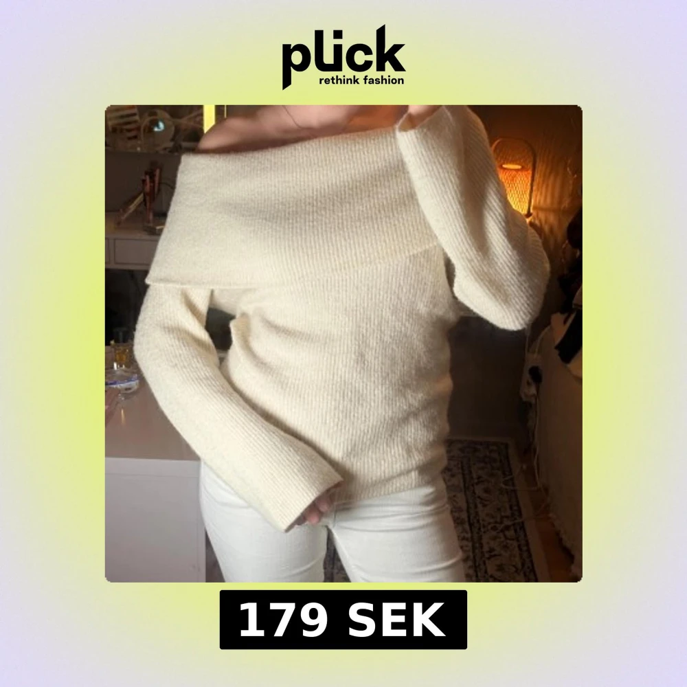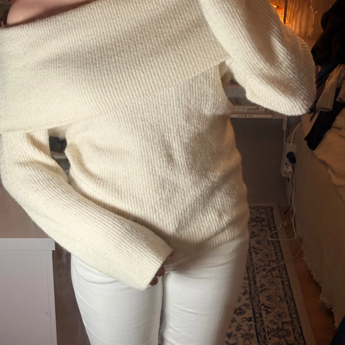 Superfin offshoulder stickad tröja från H&M i en ljus cremevit färg. Tröjan har ribbad struktur, lång ärm och bred krage som sitter snyggt över axlarna. Perfekt för dig som gillar en stilren och mysig look.
