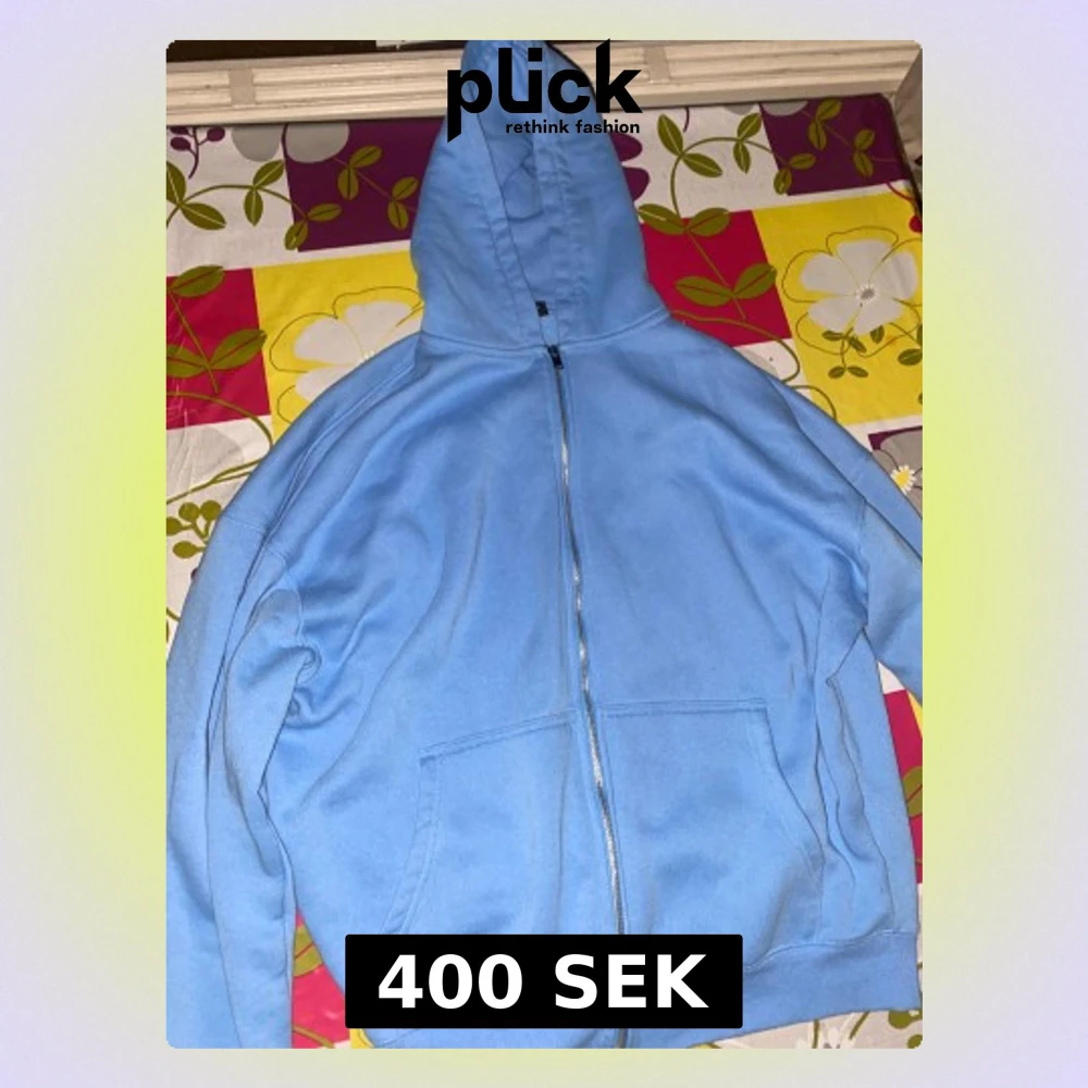 Ljusblå hoodie med hel dragkedja framtill och stor huva. Tröjan har två rejäla fickor och är tillverkad i mjuk fleece som känns skön mot huden. Perfekt för chill dagar och när du vill ha något bekvämt och enkelt. Passar dig som gillar en loose fit.