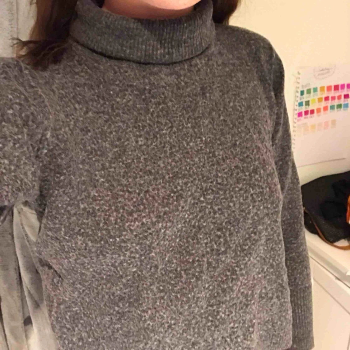 Skitsnygg typ stickad ish mörkgrå långärmad. Har som en lång polokrage som kan vikas ned. På lappen står det L men jag råkade tvätta för varmt så krympte rejält och passar nu s. Ganska kort i ärmarna och magen. Bra skick inga nopprar utan ska se ut så.