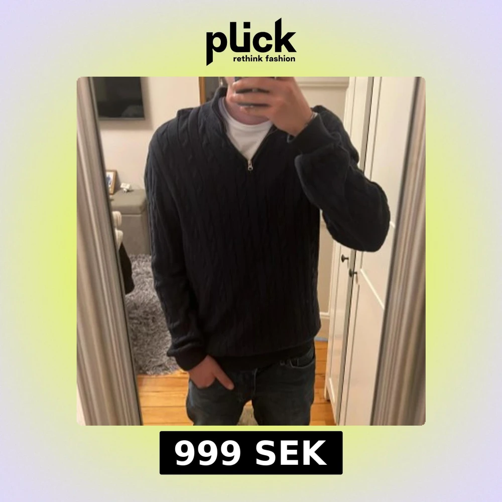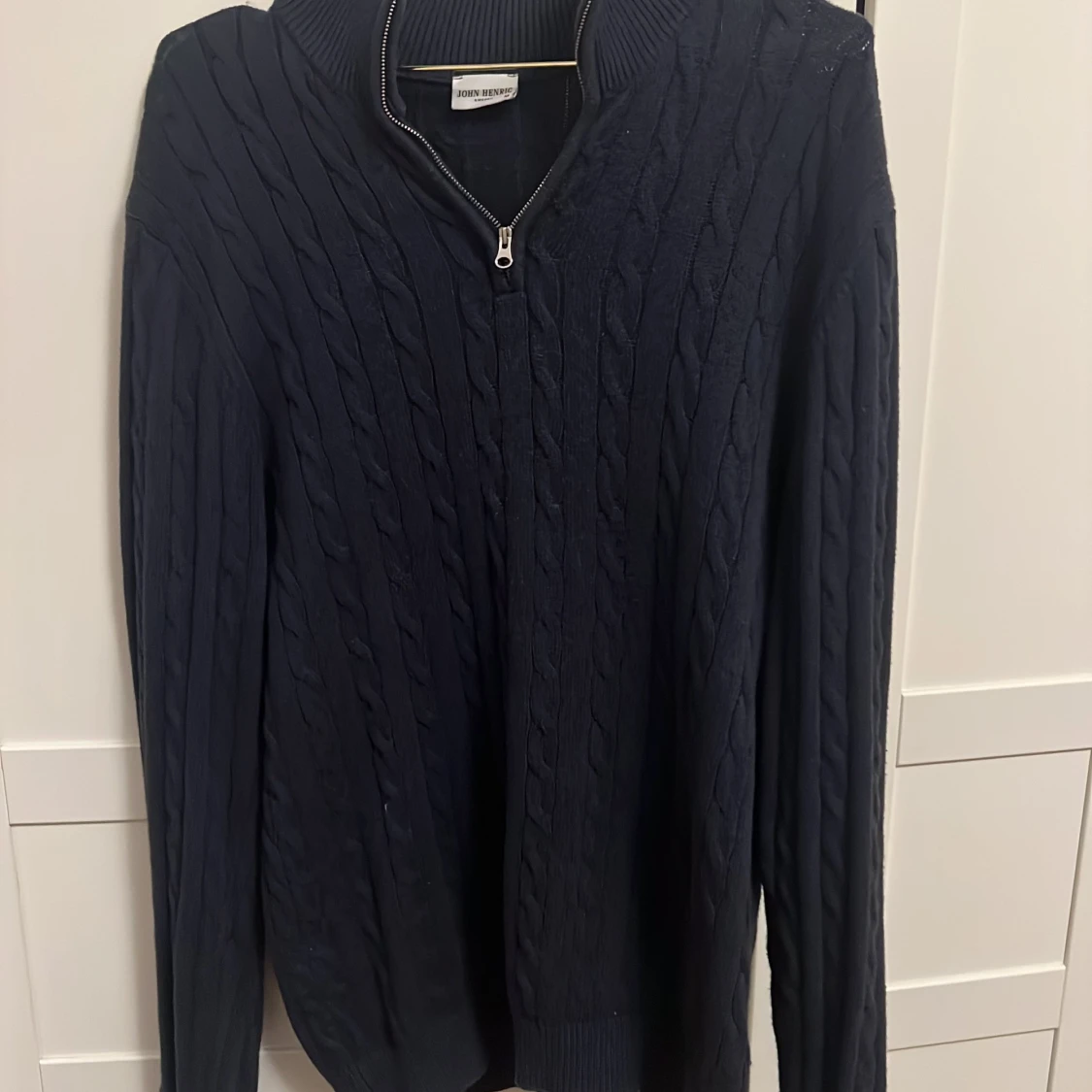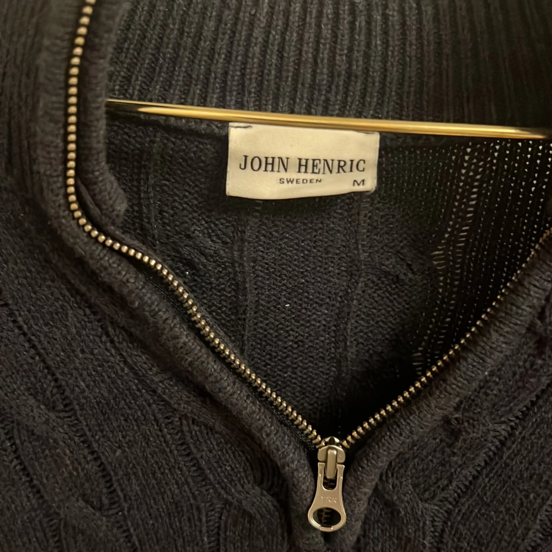 Säljer en mörkblå stickad tröja från John Henric med kabelstickat mönster och half zip-dragkedja vid halsen. Tröjan har lång ärm och ribbade muddar, perfekt för lager-på-lager och snygg till jeans.