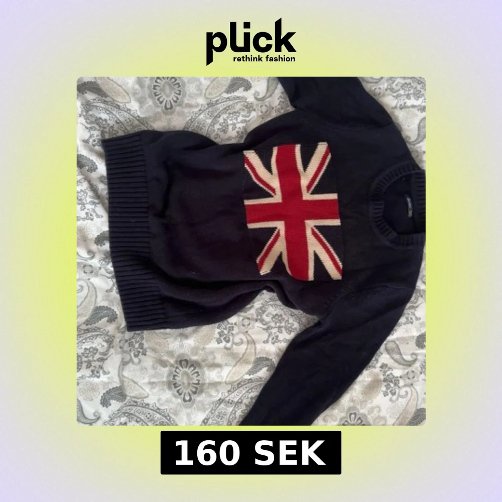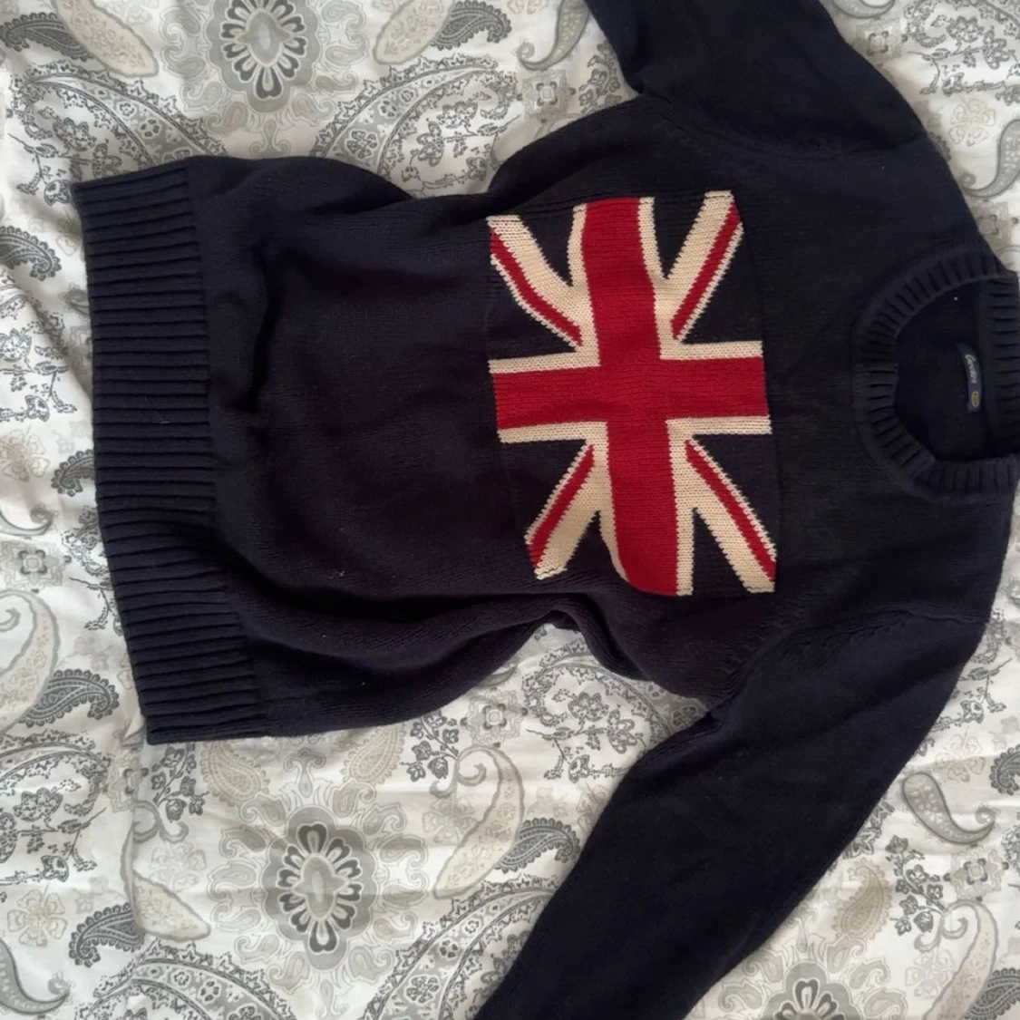 Snygg mörkblå stickad tröja från Gant med Union Jack-flagga i rött, vitt och blått på bröstet. Tröjan har rund halsringning, ribbade muddar och långa ärmar. Perfekt för dig som söker en clean och old money look