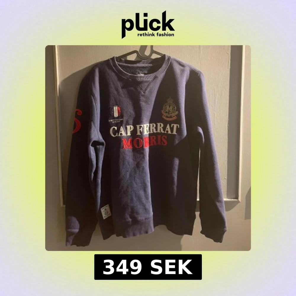 Mörkblå sweatshirt från Morris med broderad text 'Cap Ferrat Morris' i vitt och rött framtill. Tröjan har rund hals, långa ärmar och ribbade muddar. Snygga broderade detaljer och emblem på bröstet samt tryck på ena ärmen.