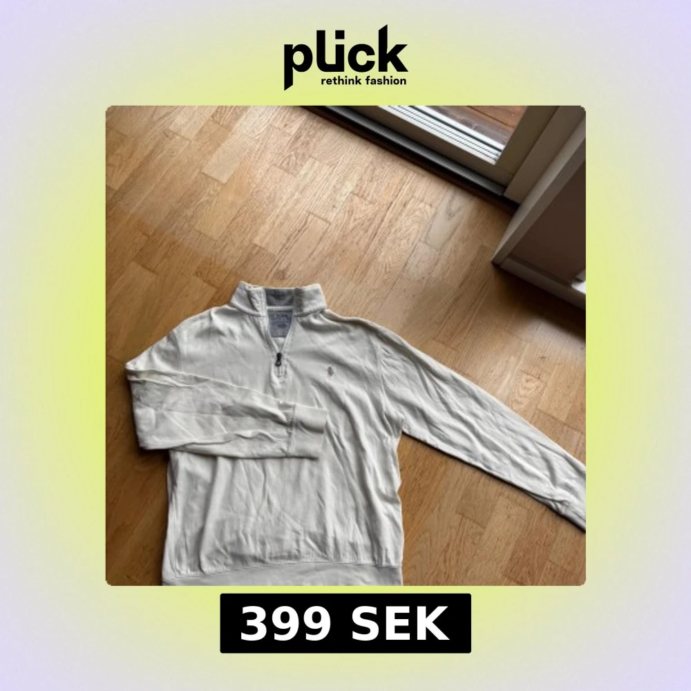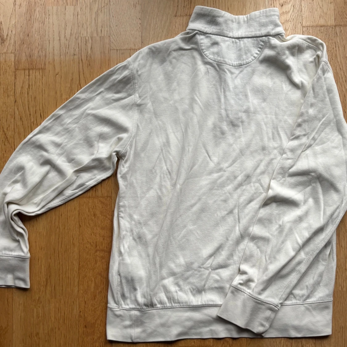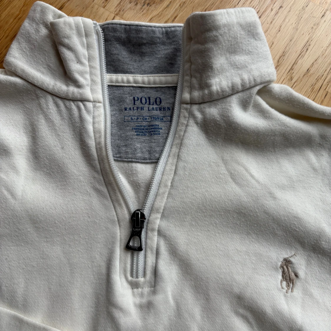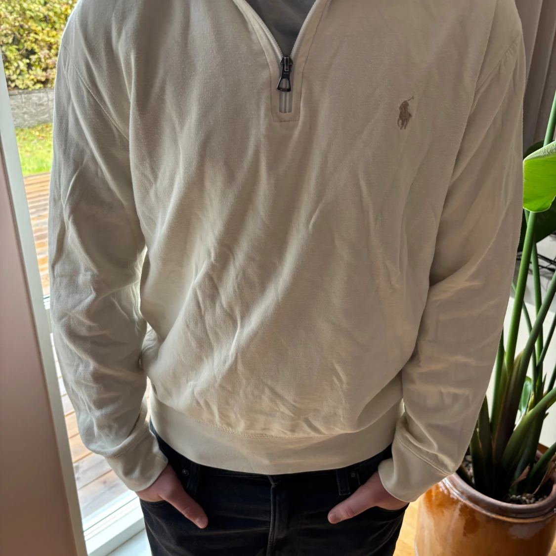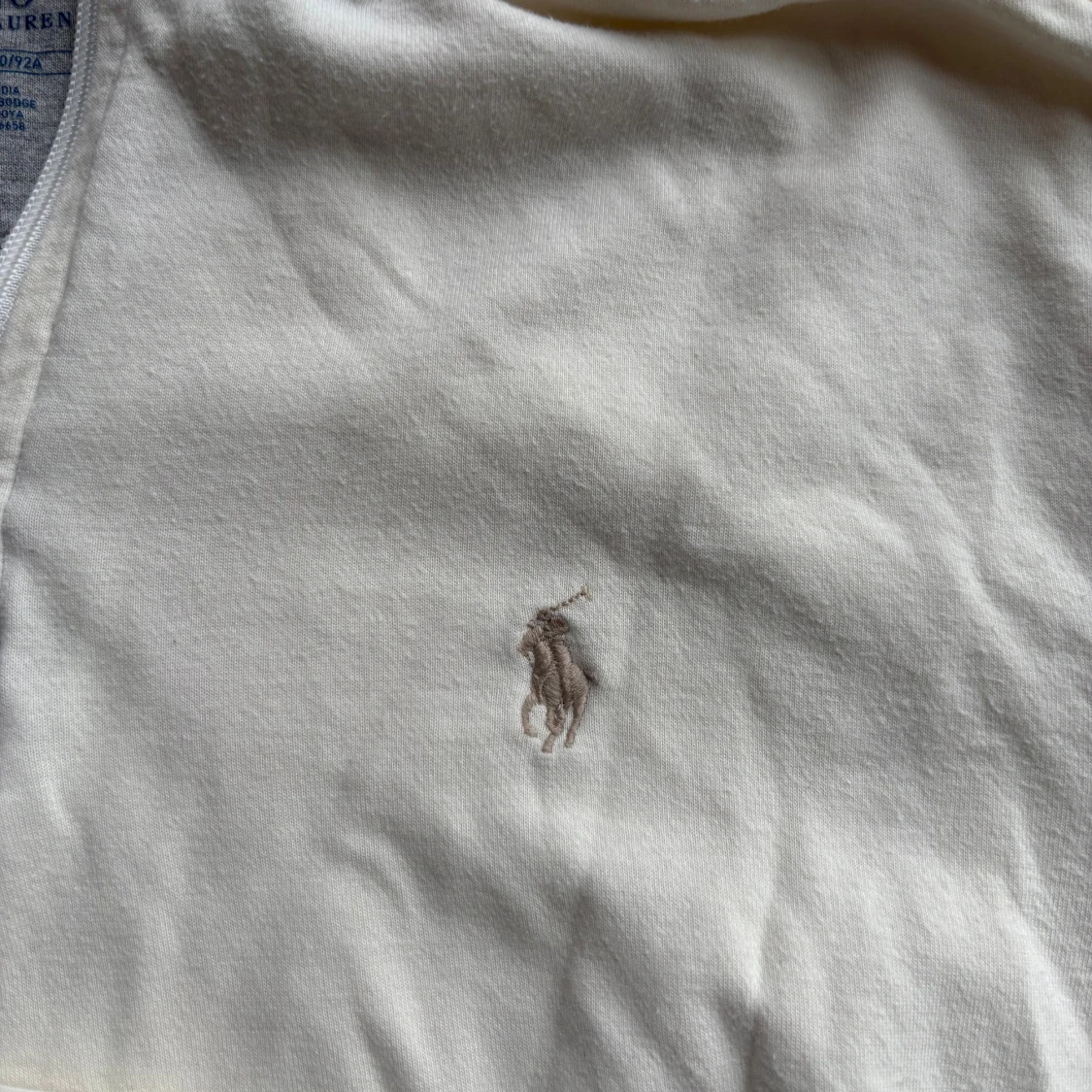 Snygg vit långärmad tröja från Polo Ralph Lauren med half zip och broderad logga på bröstet. Tröjan är gjord i mjuk bomull och har en klassisk, normal passform. Perfekt för dig som gillar stilrena och tidlösa plagg. Orginalpris: 2200kr. Modellen är 173cm lång och väger cirka 70kg.