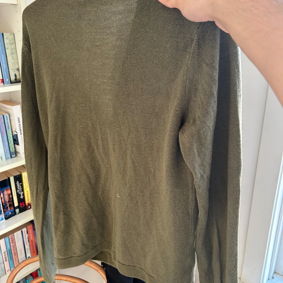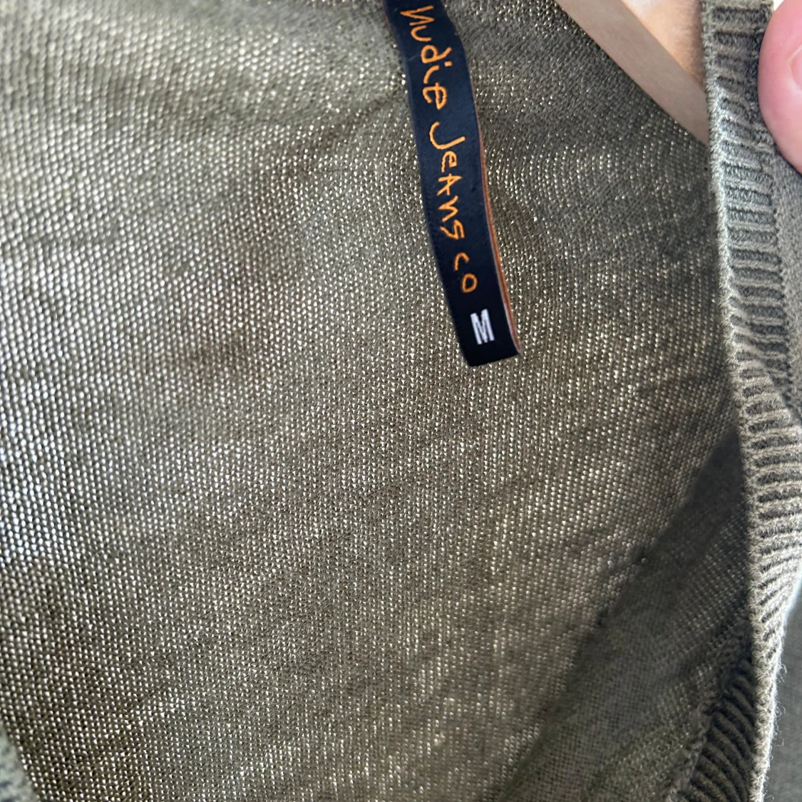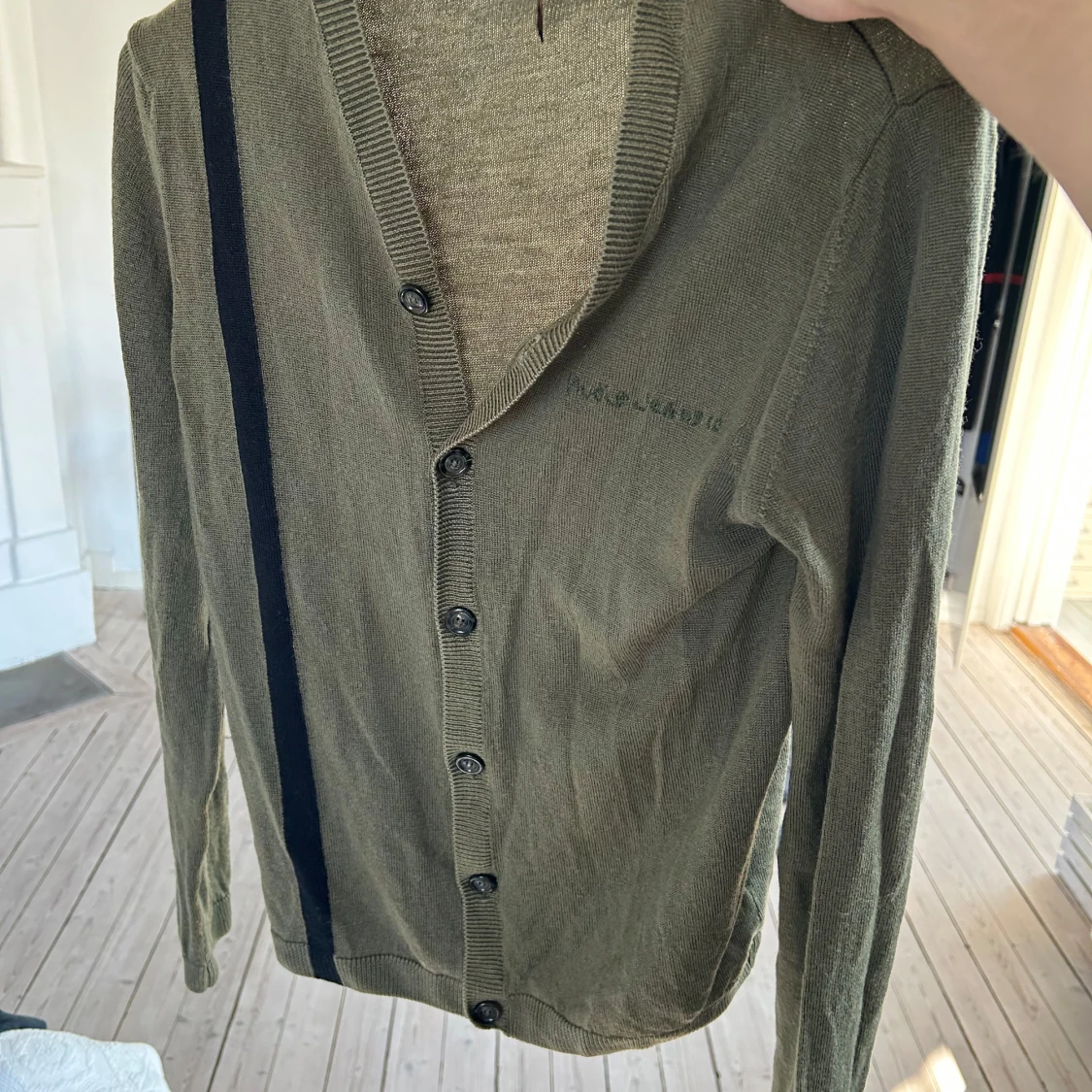 Säljer en stilren olivgrön kofta från Nudie Jeans. Den har en klassisk design med knappar framtill och ribbade kanter. Perfekt för lager-på-lager under kyligare dagar.