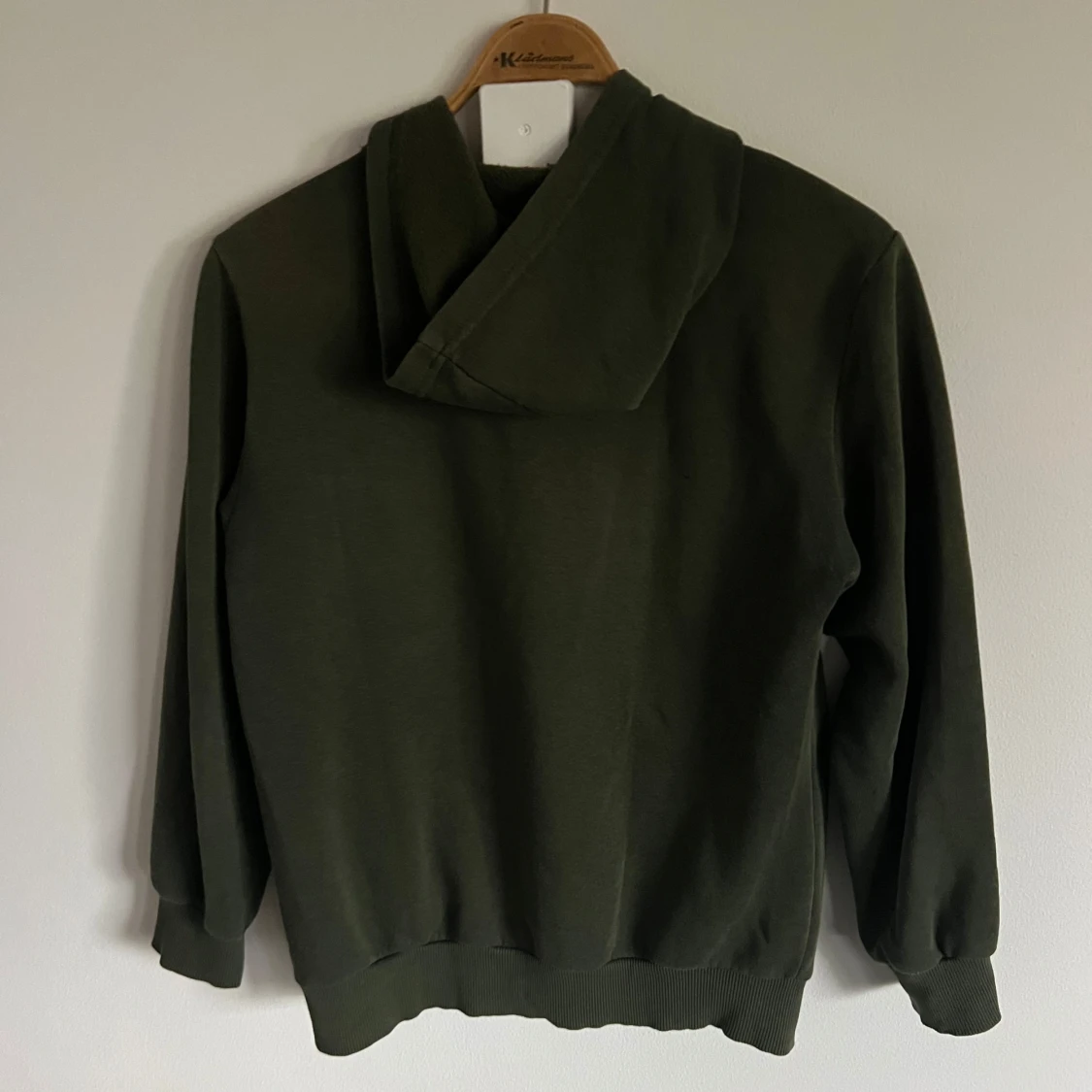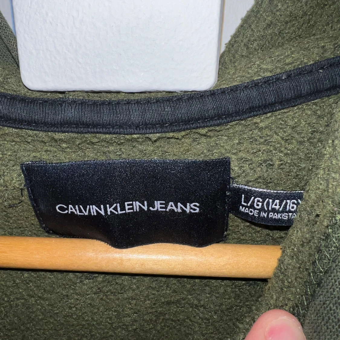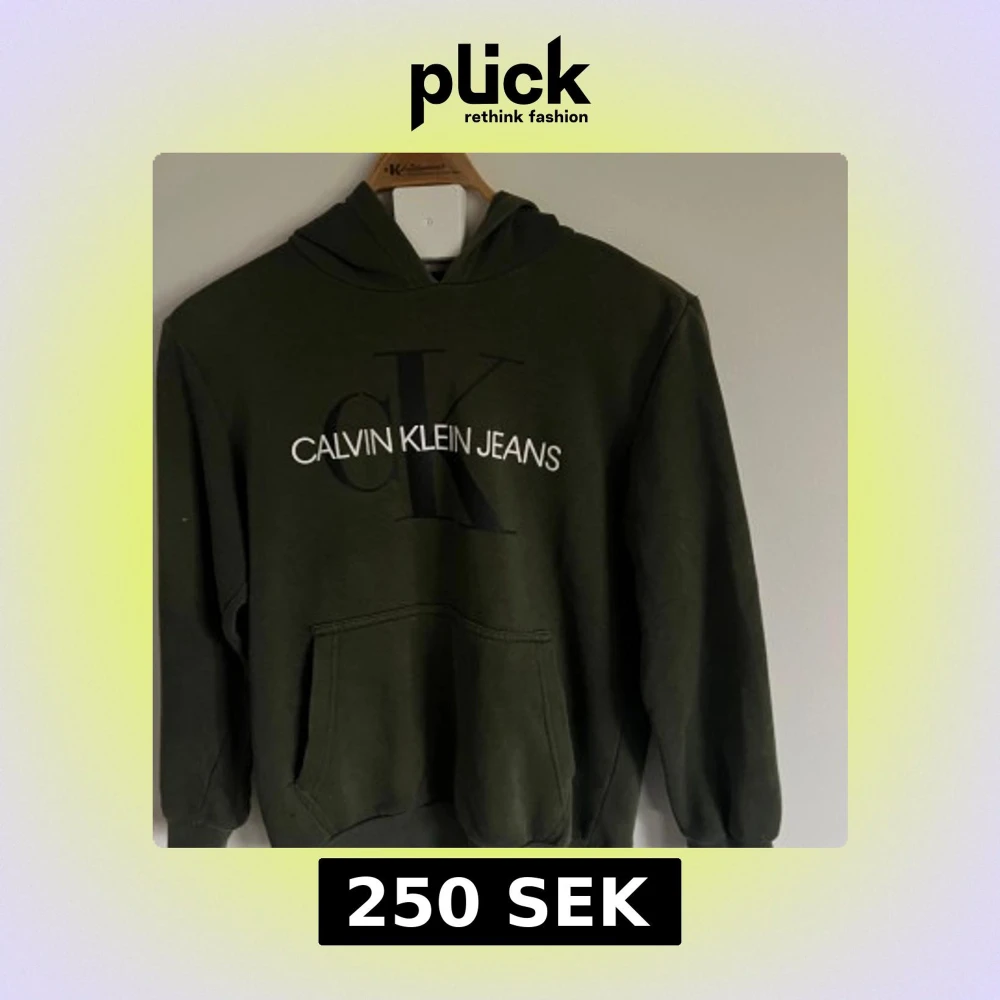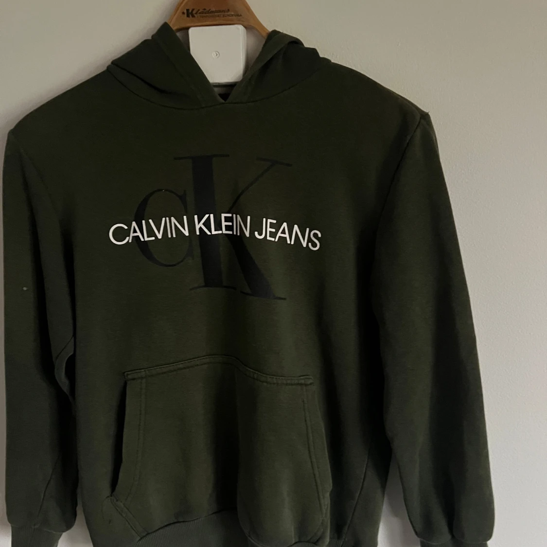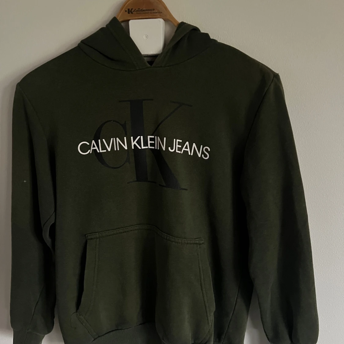 Säljer en olivgrön hoodie från Calvin Klein Jeans med stor logga framtill. Tröjan har huva, magficka och ribbade muddar vid ärmslut och nederkant. Perfekt för en avslappnad stil.