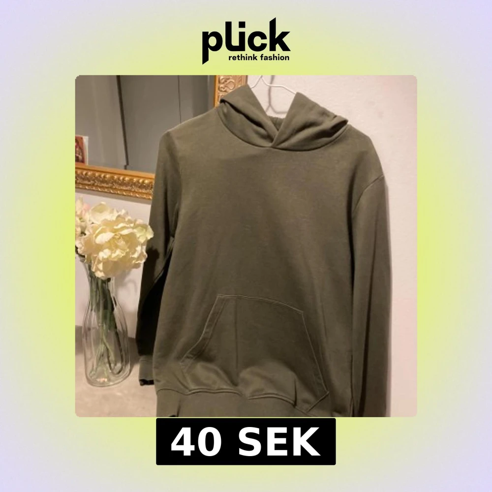 Säljer en olivgrön hoodie med klassisk känguruficka framtill och huva. Tröjan har långärmade ärmar och ribbade muddar vid ärmslut och nederkant. Väl använd men inga hål eller revor.