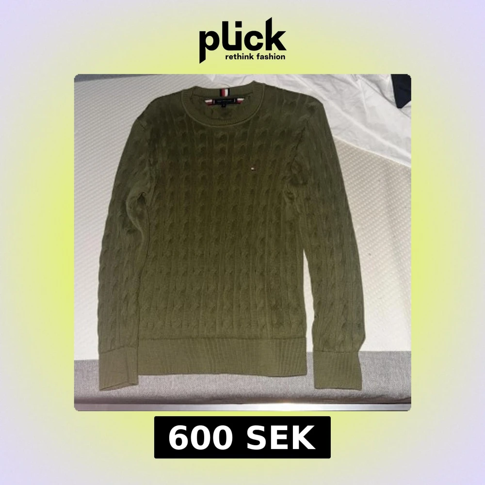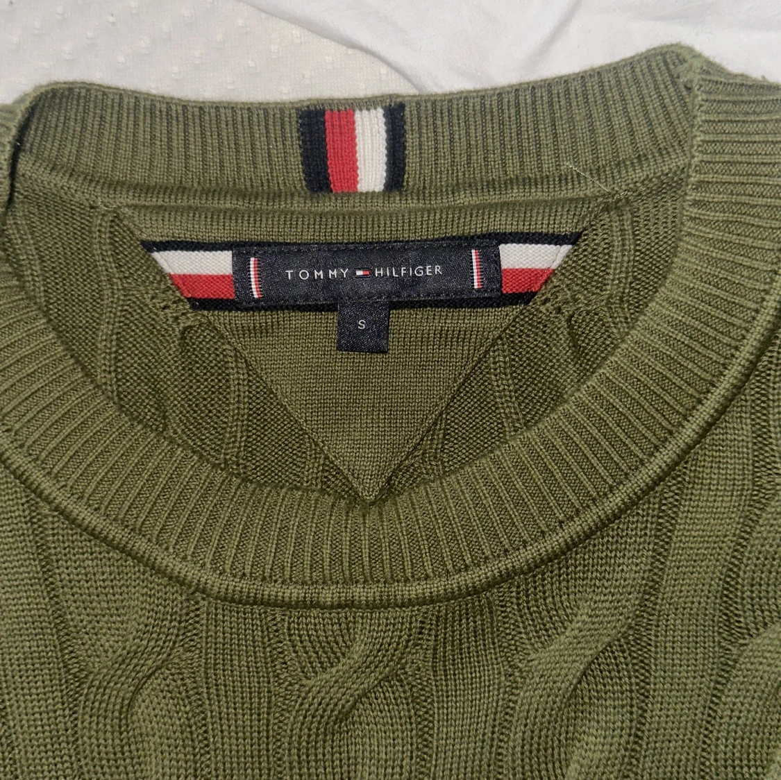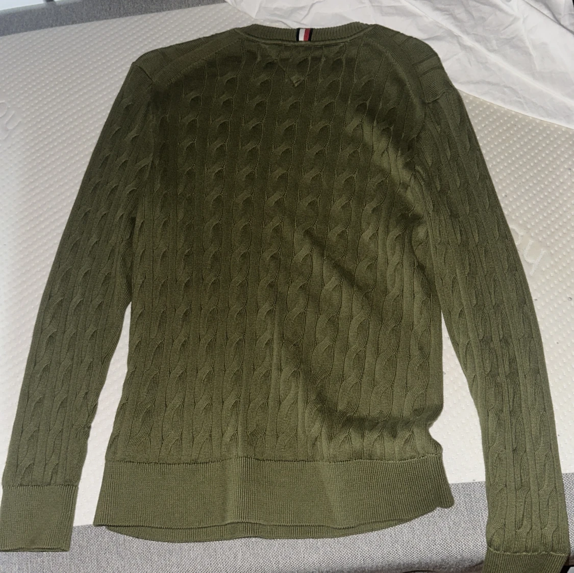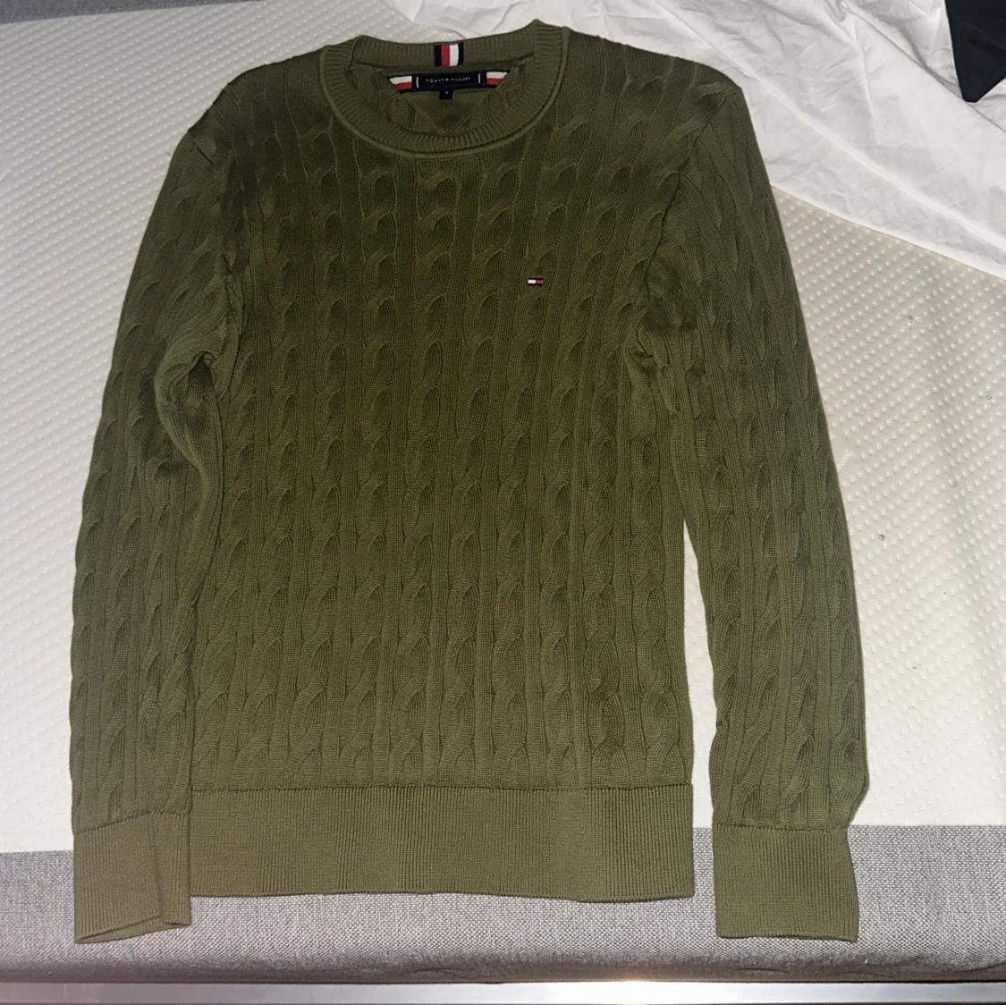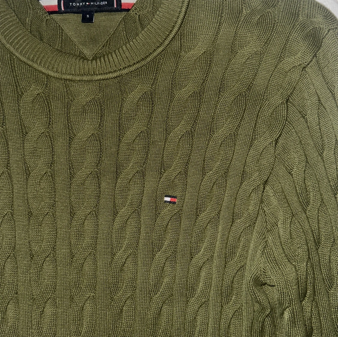 Snygg olivgrön kabelstickad tröja från Tommy Hilfiger med rund halsringning och diskret logga på bröstet. Tröjan har ribbade muddar och är långärmad, perfekt för lager-på-lager under hösten och vintern. PRIS KAN DISKUTERAS