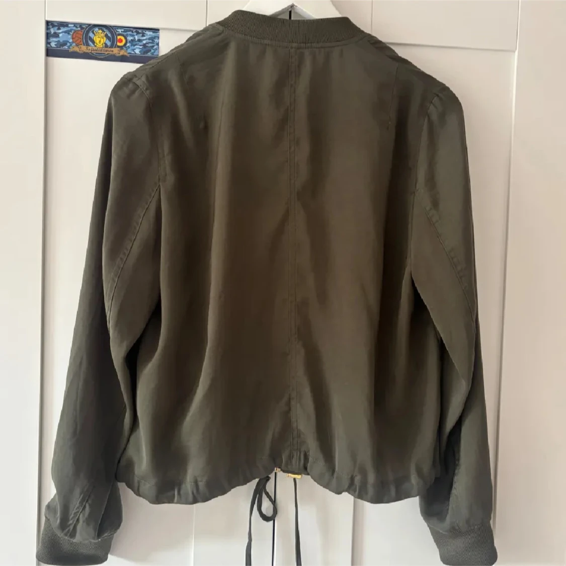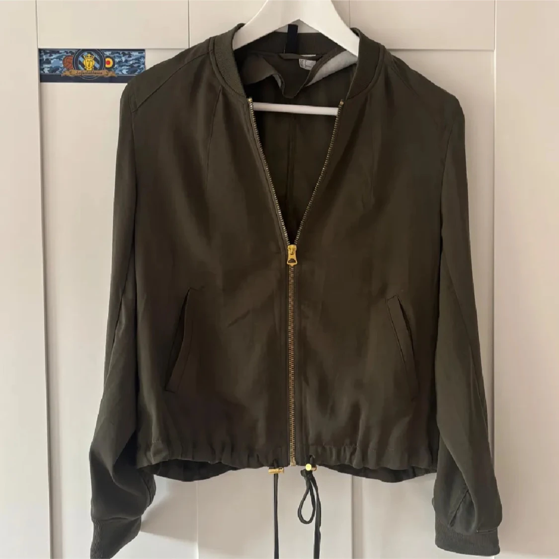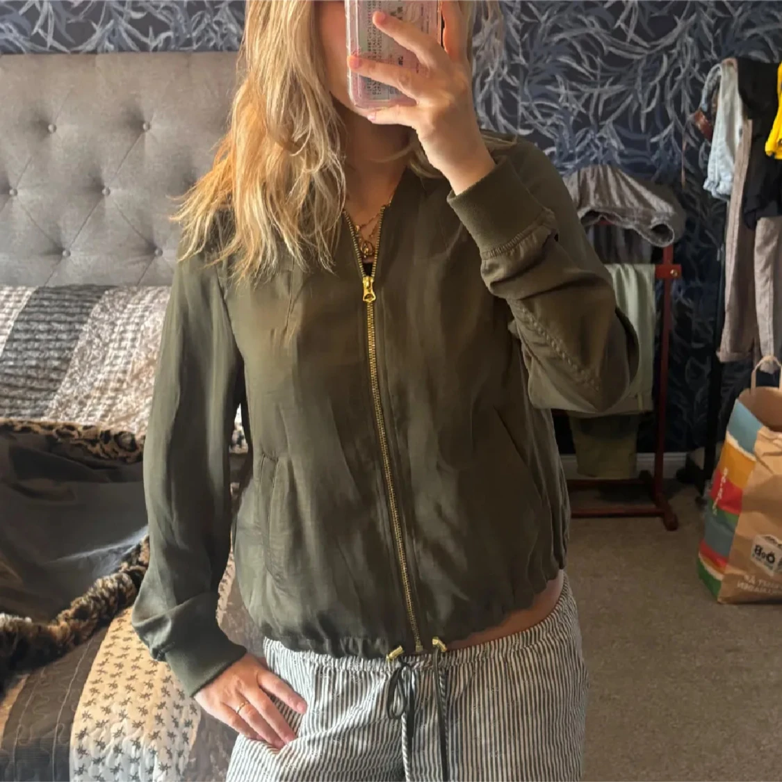 Snygg olivgrön kofta från H&M med guldfärgad dragkedja och snygg design. Jackan har ribbade muddar vid ärmslut och krage, samt två fickor framtill. Perfekt för dig som vill ha en clean och avslappnad stil. Väldigt tunn, och perfekt att bara slänga på när det blåser.