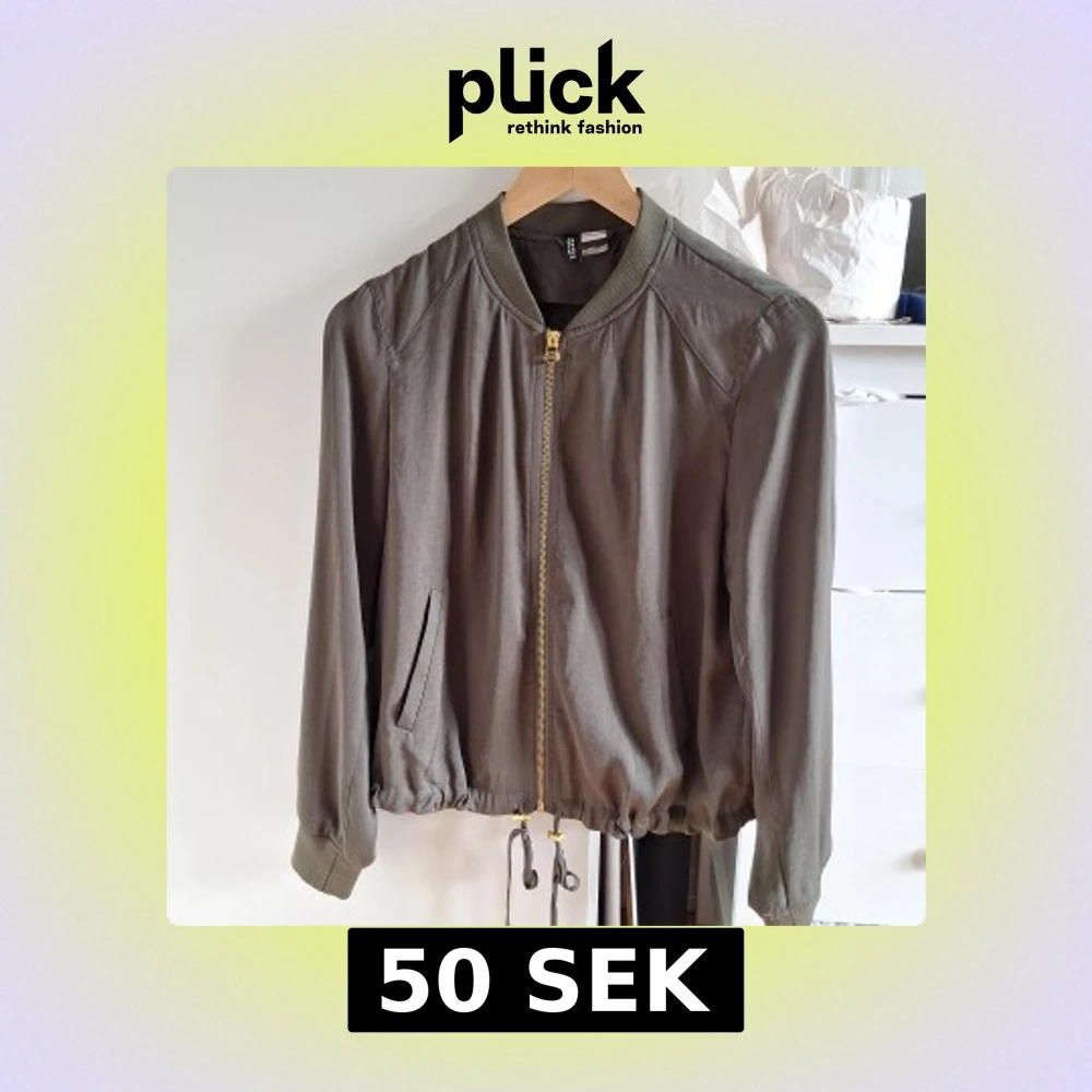 Snygg olivgrön kofta från H&M Divided med guldfärgad dragkedja, ribbade muddar och dragsko nertill. Koftan har två fickor och är i ett lätt material som passar perfekt till vår och höst. Enkel och stilren design som funkar till många outfits.