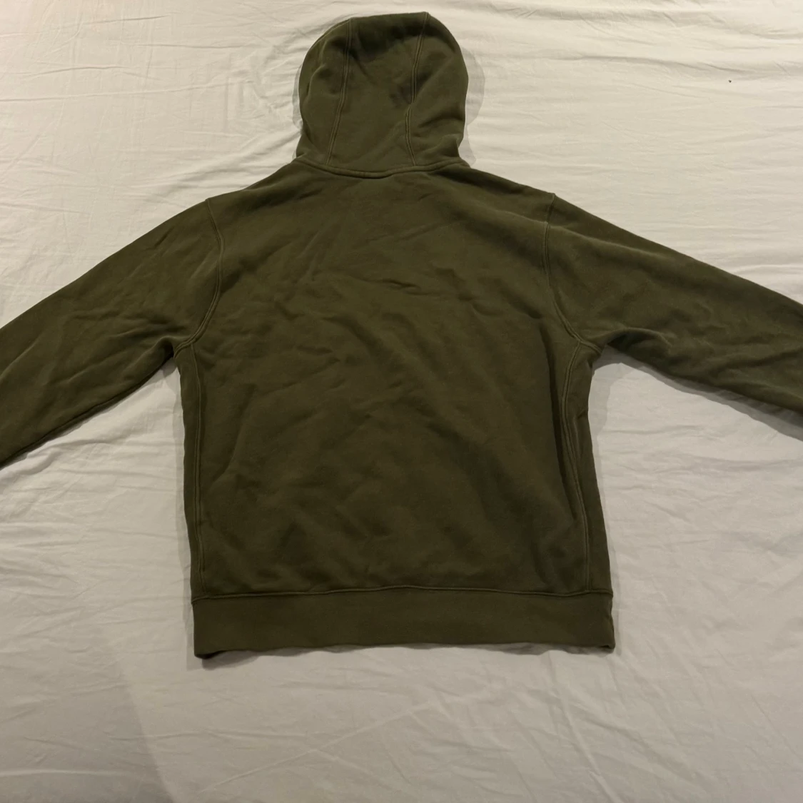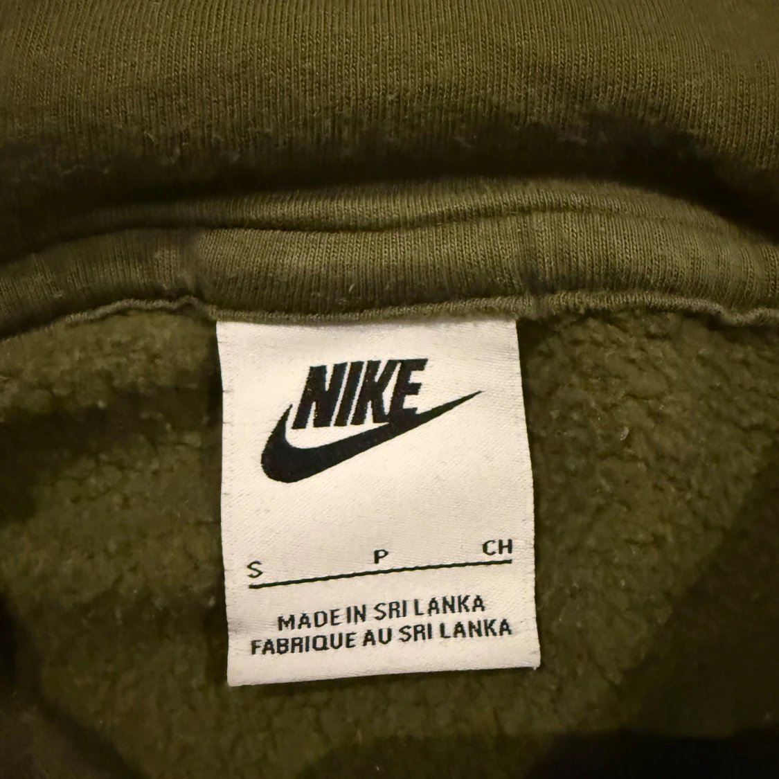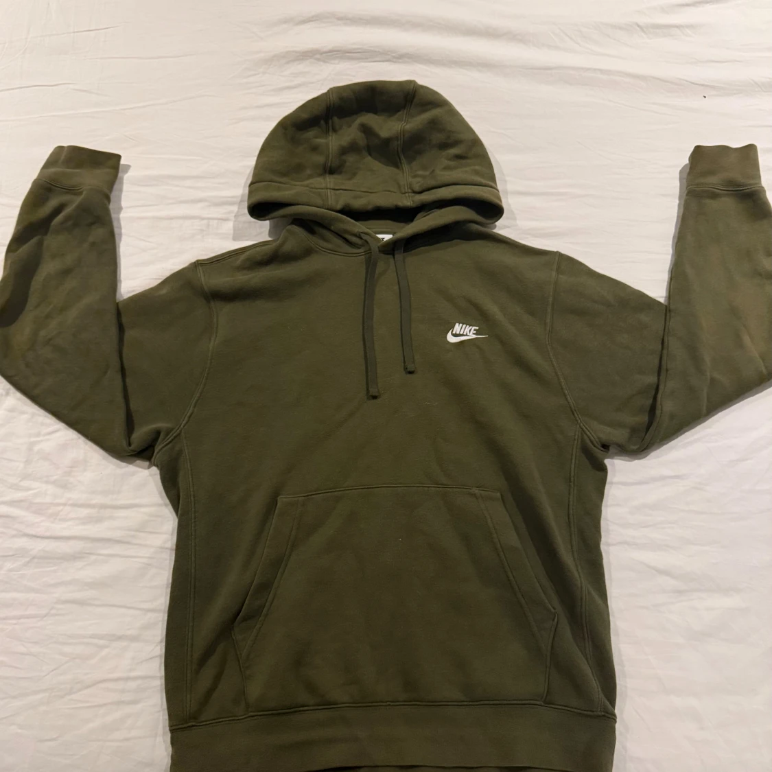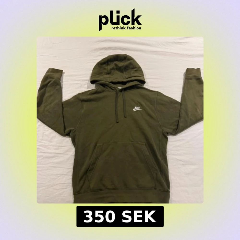 Olivgrön hoodie från Nike storlek S (men jag som har M pasar den även)med klassisk logga på bröstet. Tröjan har huva med snörning, magficka och långa ärmar. Mjuk insida och ribbade muddar vid ärmslut och nederkant. Perfekt för chill eller streetwear.fråga gärna frågor om ni undrar nåt