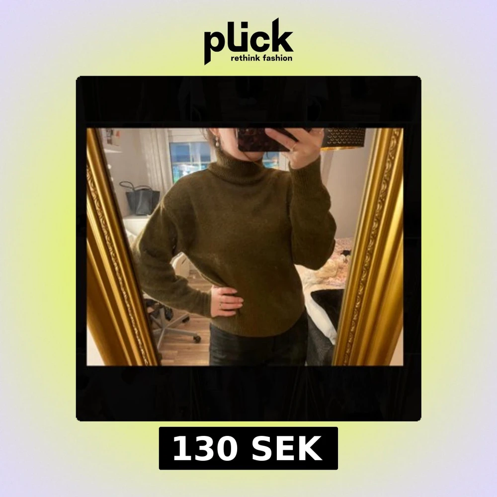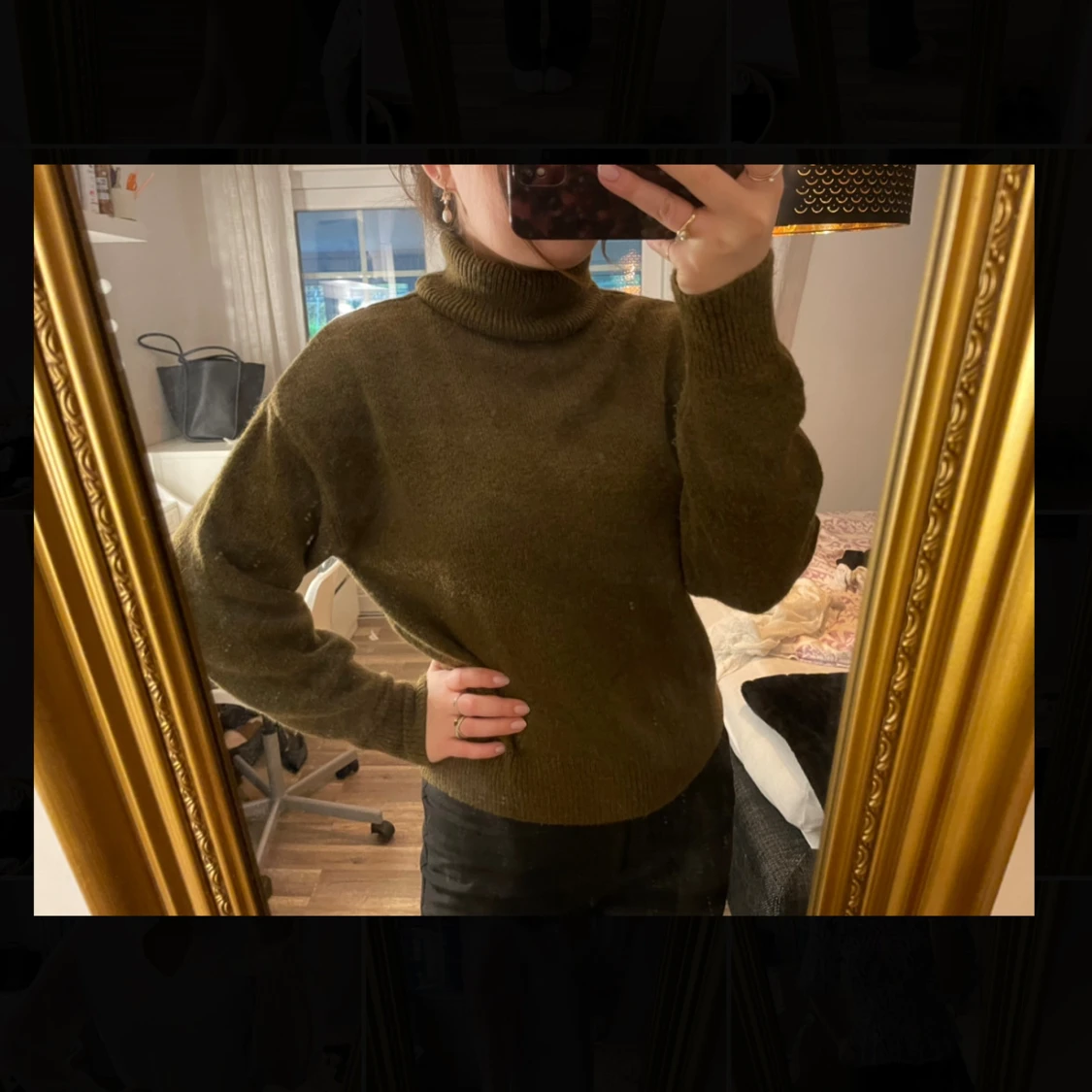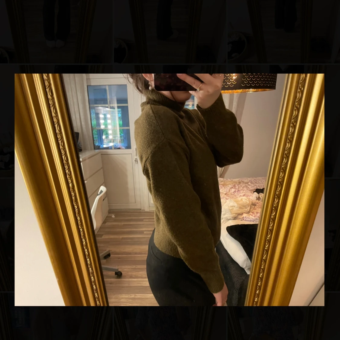 Säljer en olivgrön polotröja med lång ärm och hög krage.