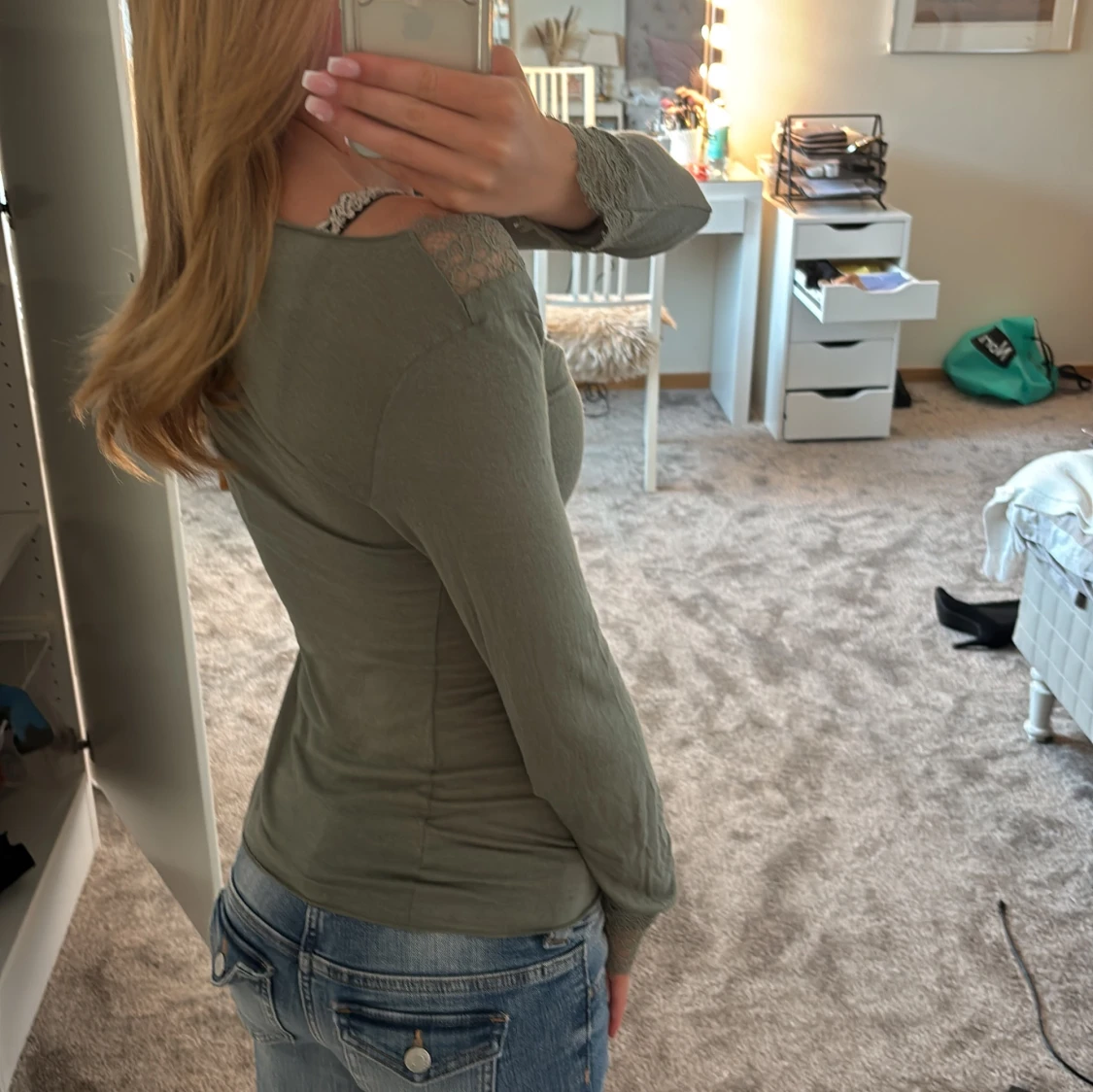 Supersnygg olivgrön långärmad topp från Intimissimi med v-ringning och spetsdetaljer vid halsringning och ärmslut. Tight passform och tillverkad i en mjuk blandning med kashmir. Älskar verkligen dessa tröjor men vill köpa denna i en annan färg 🤗💗Använd max 3 gånger