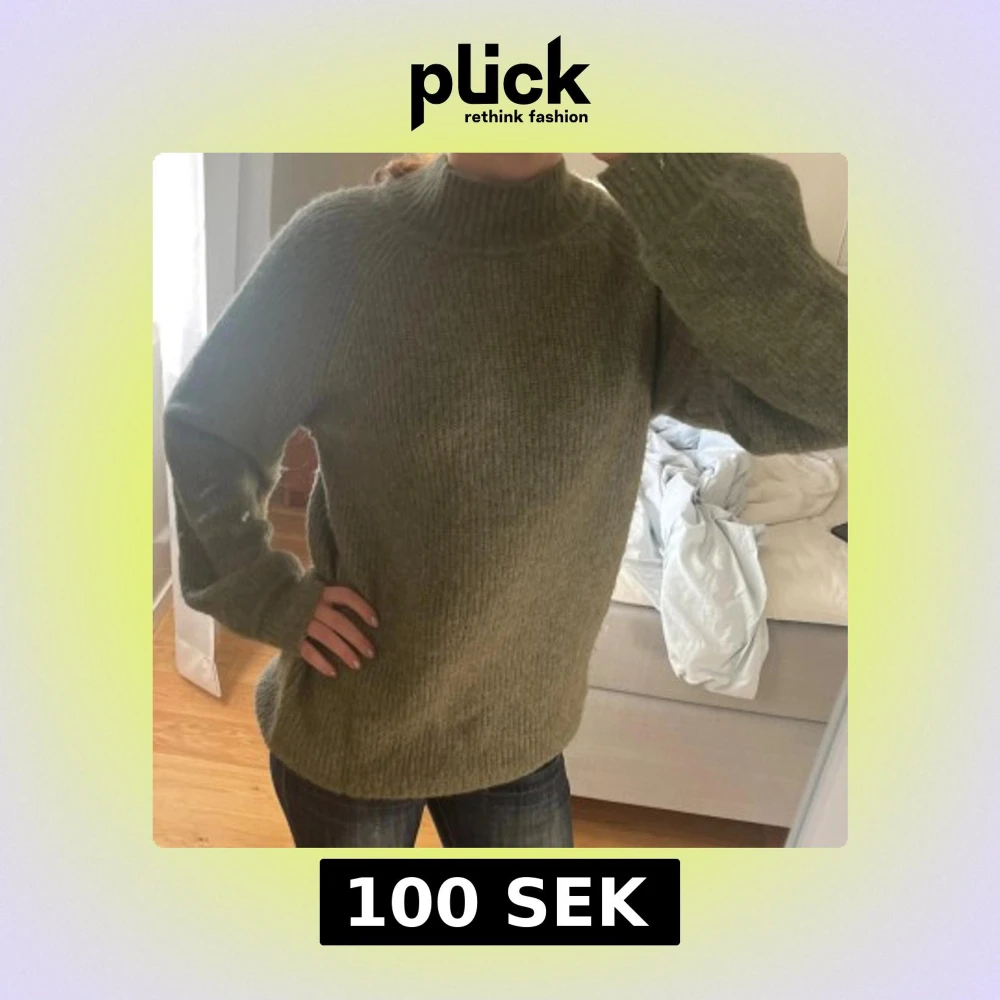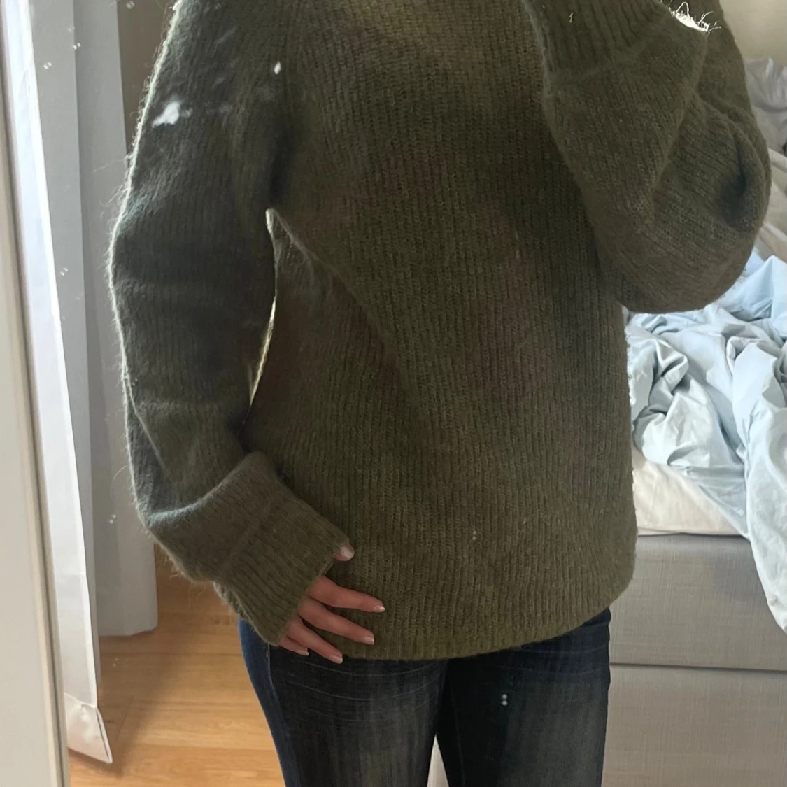 Mysig olivgrön stickad tröja från Lindex i storlek S. Tröjan har en hög hals och långa ärmar med ribbade muddar. Perfekt för kyliga dagar och har en loose passform Materialet är mjukt och värmande.