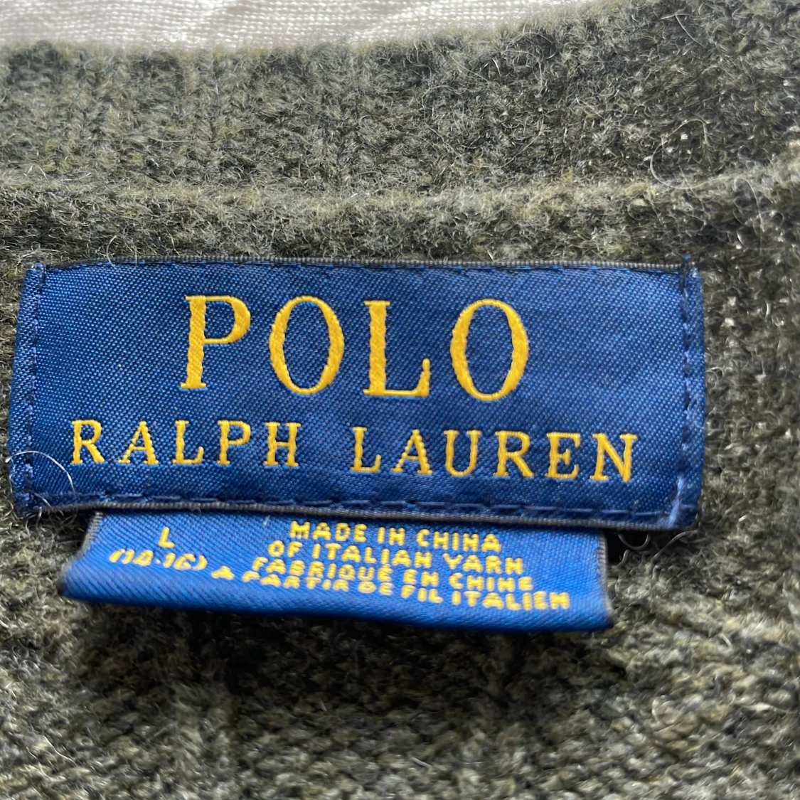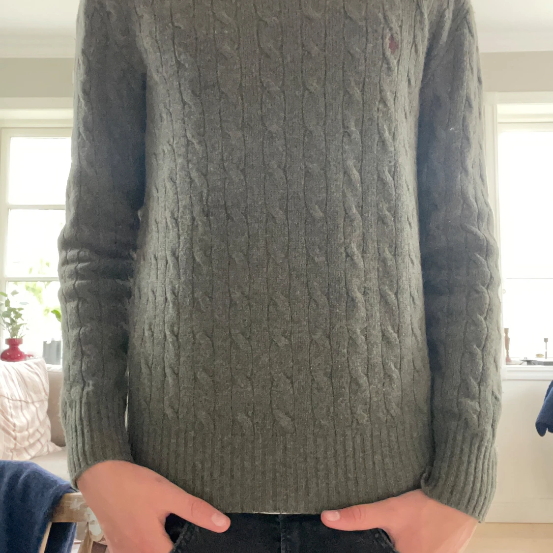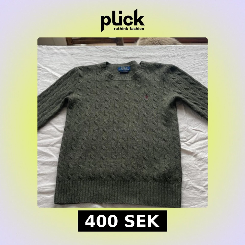 Säljer en olivgrön stickad tröja från Polo Ralph Lauren med klassiskt kabelstickat mönster och rund halsringning. Tröjan har lång ärm och liten broderad logga på bröstet. Perfekt för lager-på-lager-stil. Passar dig ifrån 158-170