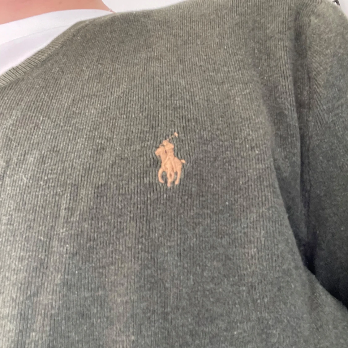 Säljer en olivgrön stickad tröja från Ralph Lauren med klassisk broderad logga på bröstet. Tröjan har rund halsringning och långa ärmar. Perfekt för lager-på-lager och stilren vardagslook.